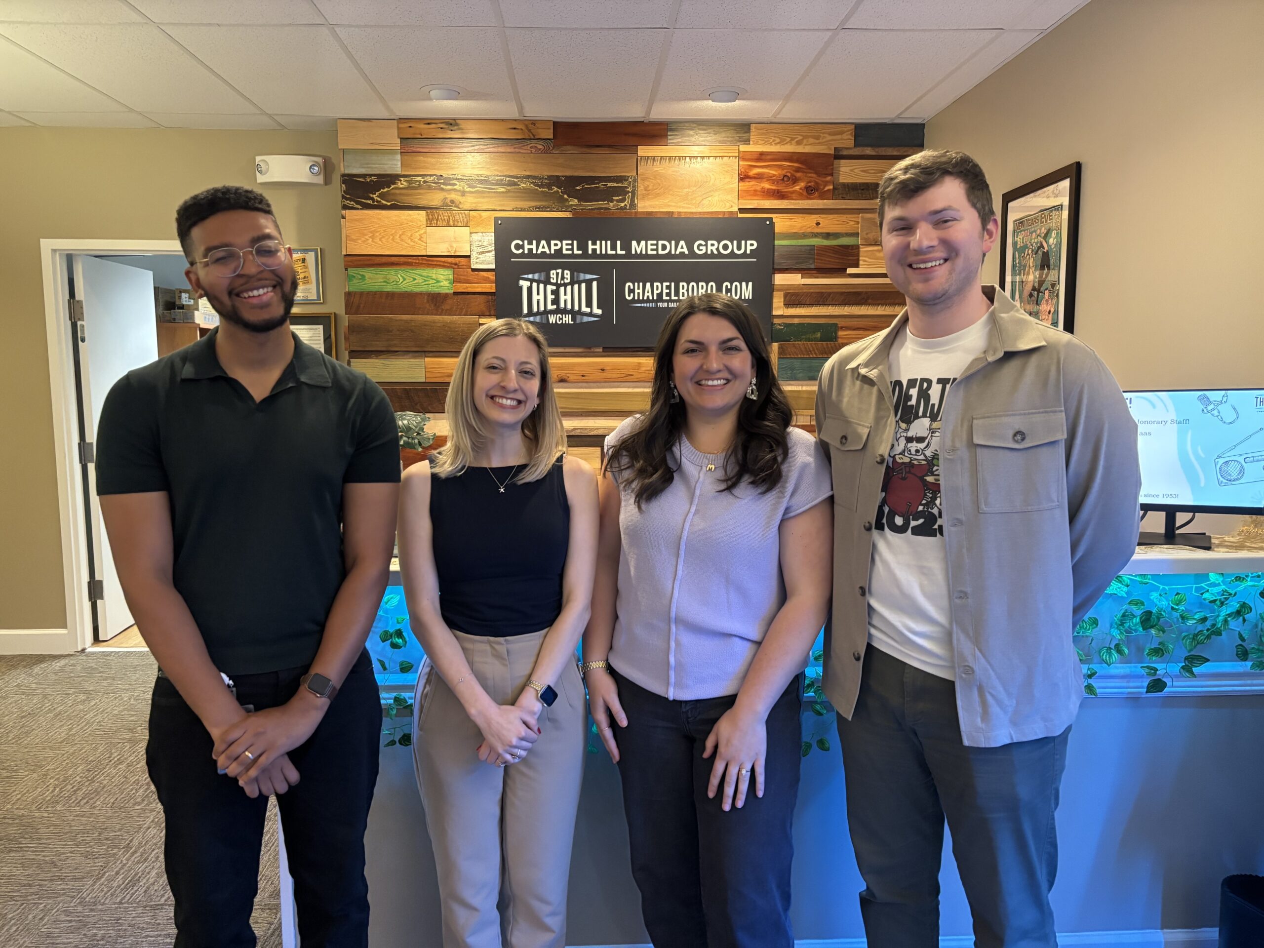 From left to right: Kyle Chambers, Alexa Doran, Meghan Lassiter and Brighton McConnell at the Chapel Hill Media Group studios.