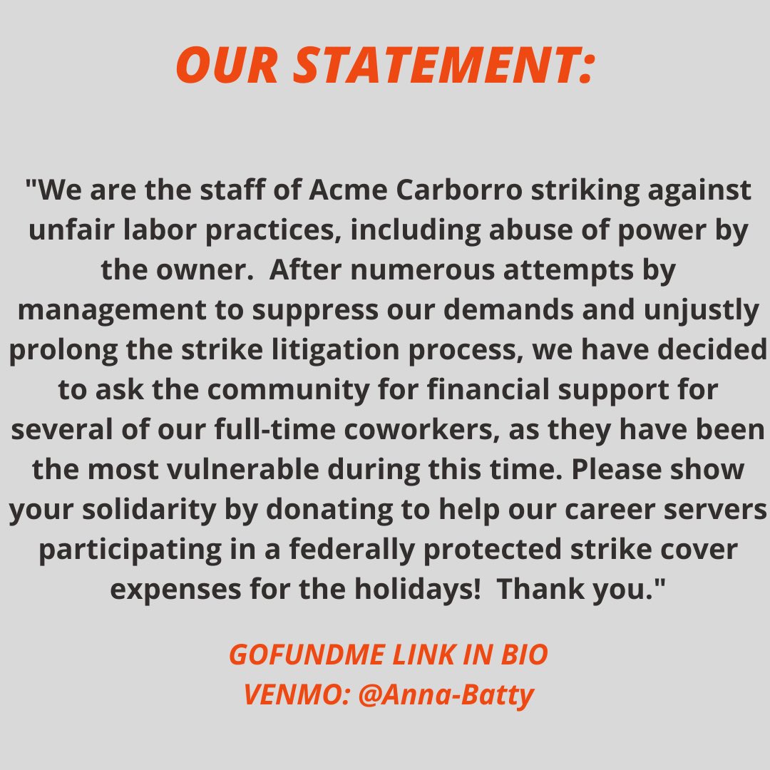 Acme staff issued a statement and a GoFundMe fundraiser regarding unfair treatment in the workplace (Photo shared via Twitter).