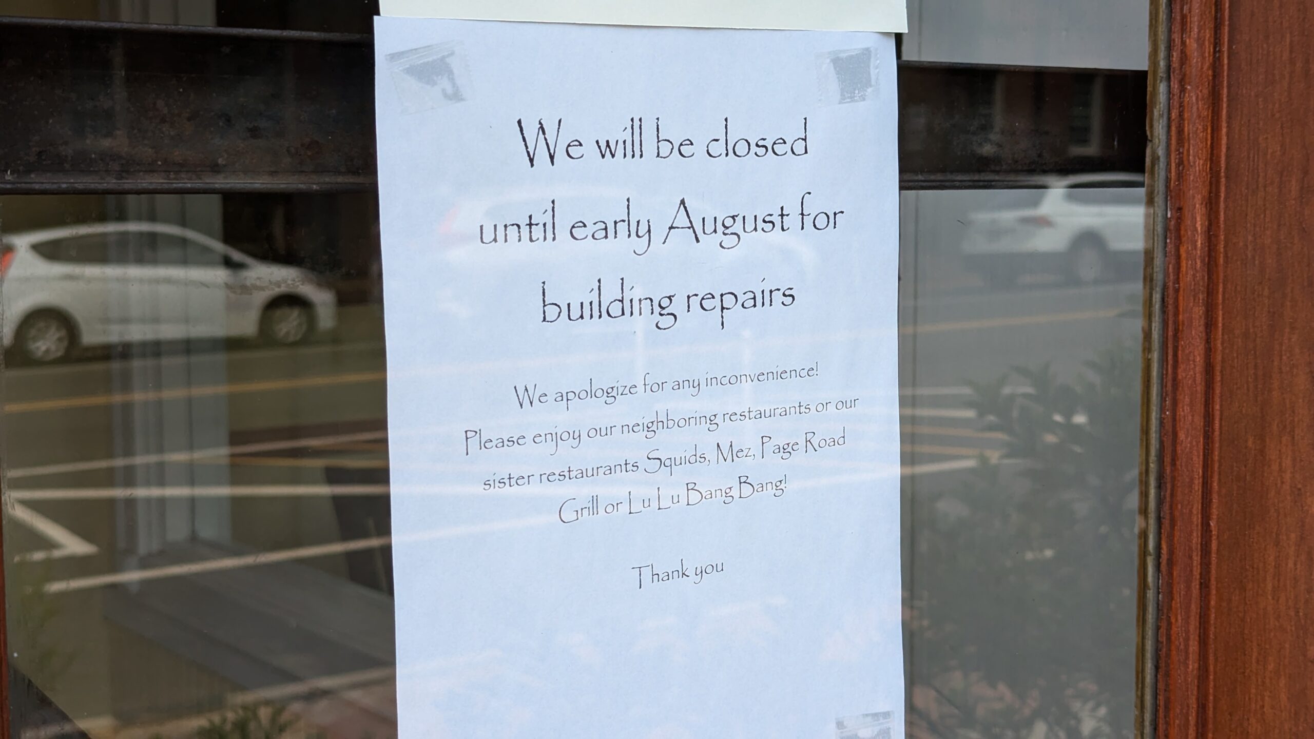 The business, which is located at 411 West Franklin Street, intermittently closed in the first week of July during the onset of issues, but the extent of problems with its piping and plumbing caused ownership to fully close ahead of lengthy work around the building and street.