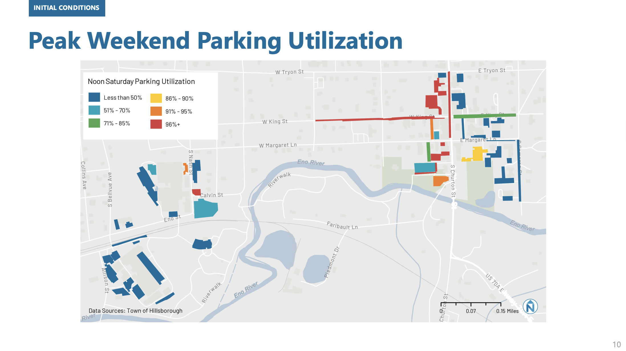 Hillsborough launched the parking study in April to help develop a long-term parking management strategy to consider alongside planning initiatives and projects. While lots further from the downtown core are often underutilized during the day, Banks said parking spaces along West King Street and Churton Street can reach capacity every day of the week.