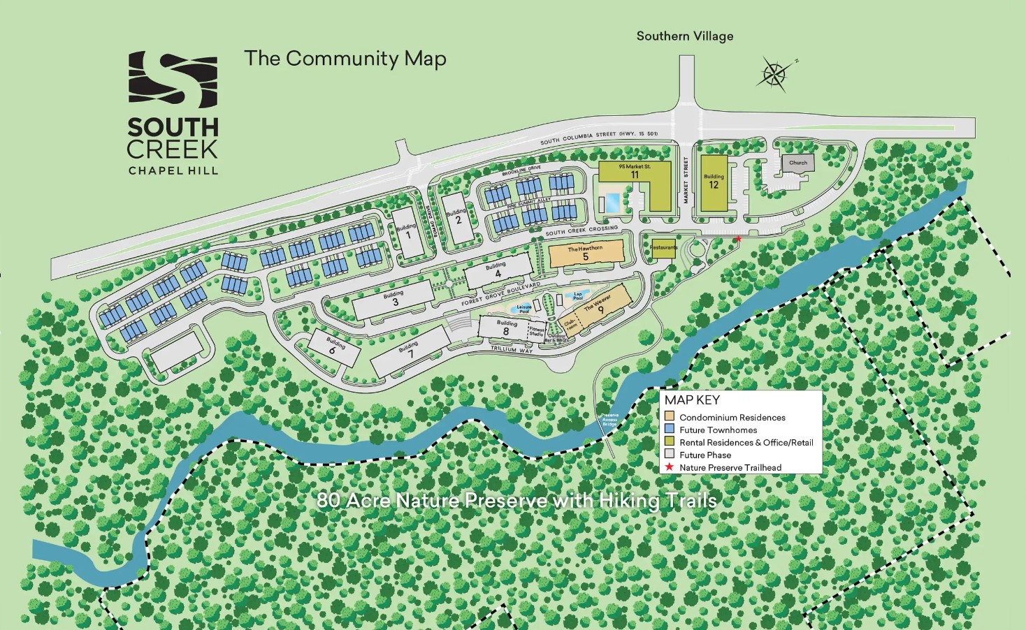 While the 92 apartments in the 95 Market building will be for-rent, the 600 condominiums and 100 other townhomes set for construction at South Creek will be for-sale units. Most will be at market rate, while 15% of the total units will be reserved for lower, more affordable prices. The residences will be accompanied by around 52,000 square feet of commercial space, plus a new playground, traffic lights and crosswalks across U.S. 15-501, and connections to nearby hiking trails.