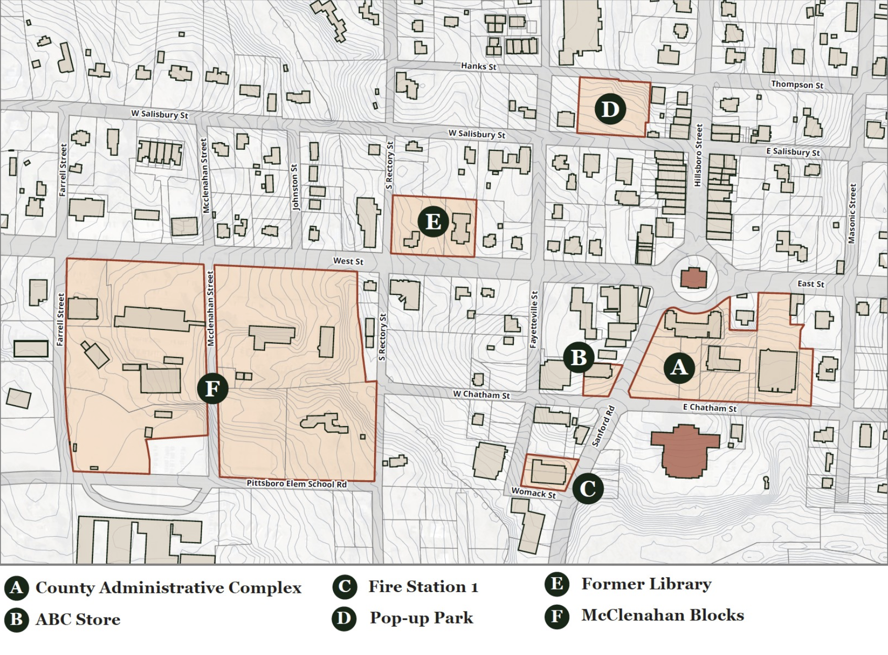 The sites available for development include Chatham County’s Administrative Complex in the heart of downtown, an ABC store, a fire station along Sanford Road, a pop-up park located west of Hillsboro Street, a former library at West Street and Rectory Street, and multiple buildings and park space west of the downtown core.