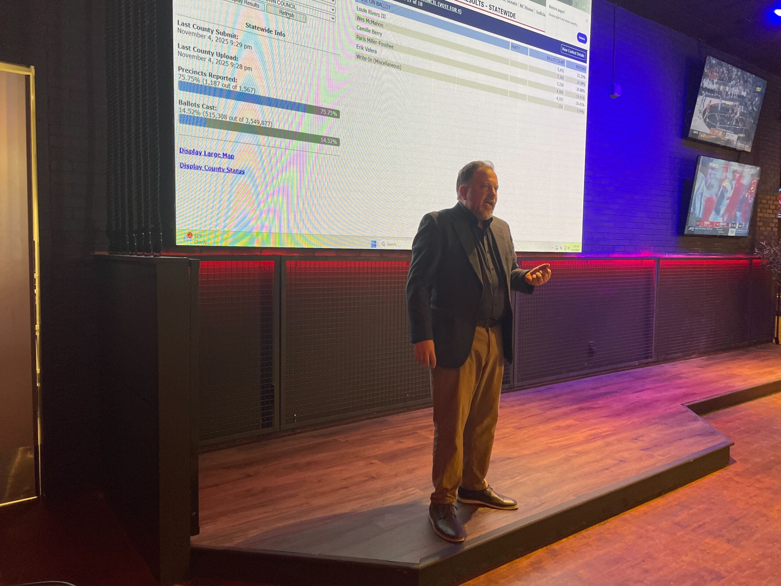 Chapel Hill Town Council candidate Wes McMahon gives a victory speech to supporters at One.40 Social in Chapel Hill on Nov. 4, 2025. Chapel Hill Mayor Jess Anderson and fellow town council candidate Louie Rivers III also delivered speeches at the party to celebrate their election. (Photo by Andrew Stuckey/Chapel Hill Media Group.)