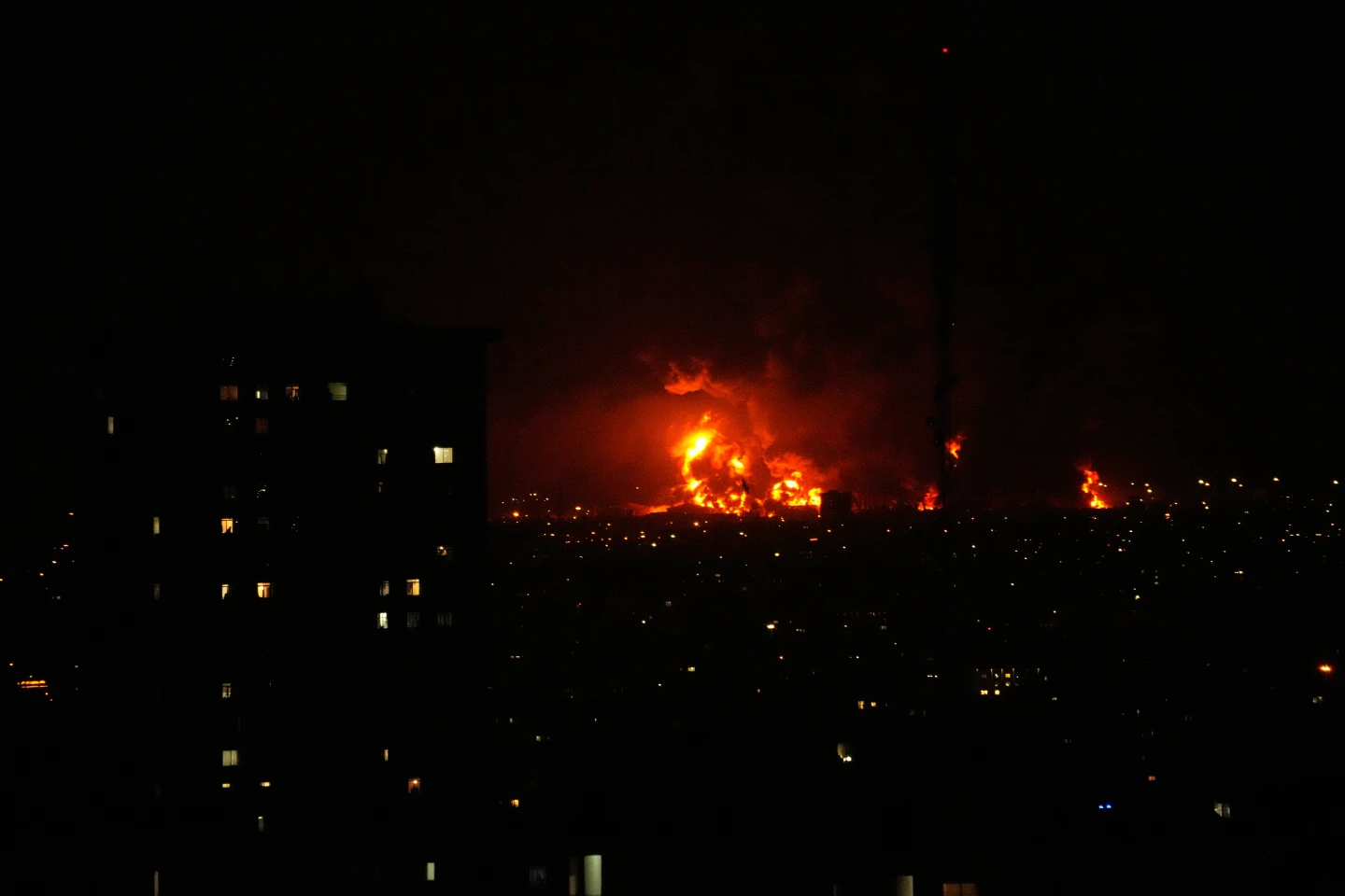 Flames rise from an oil storage facility south of the capital Tehran as strikes hit the city during the U.S.–Israel military campaign, Iran, Saturday, March 7, 2026. (Photo via AP Photo/Vahid Salemi.)