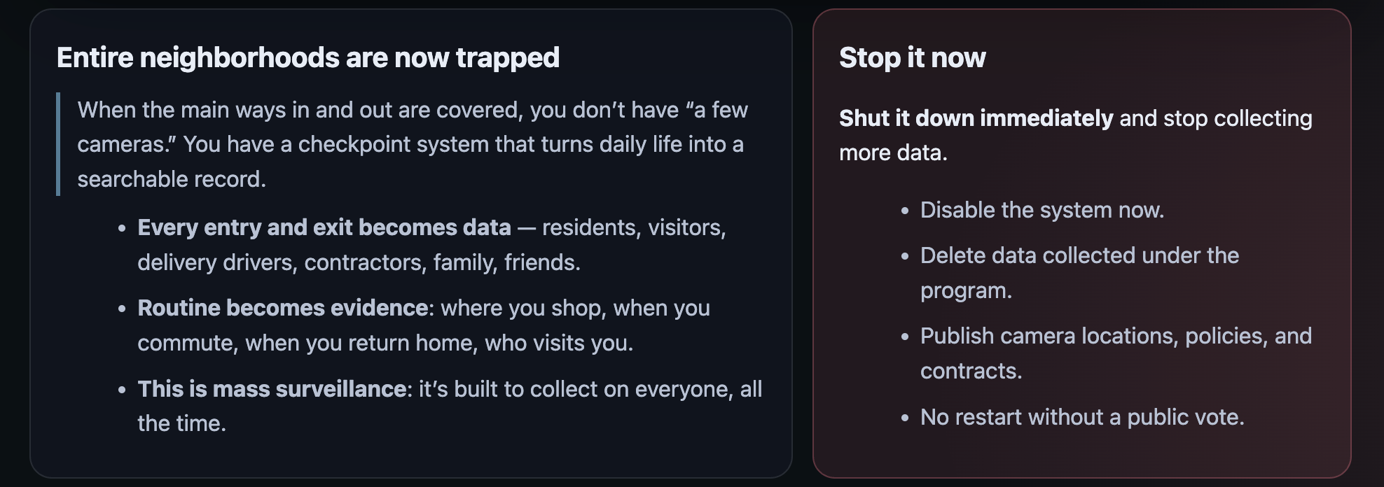 “Now, we might not be paying much for these cameras, but that’s because we are the product,” Cat said. “Flock happily will make money off of selling that data, selling that video feed to consumers, whether they be the public entities for law enforcement purposes or private entities for commercial purposes. And frankly, I think it’s inappropriate for us to have these sources of data just leaking private information, and I highly suggest a moratorium on the use of them in the future.”