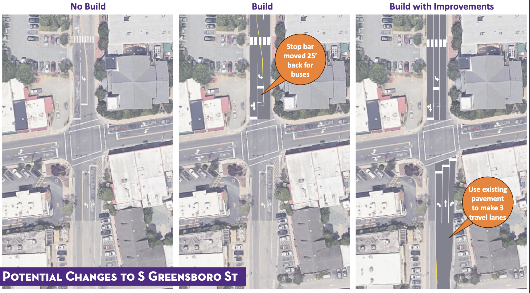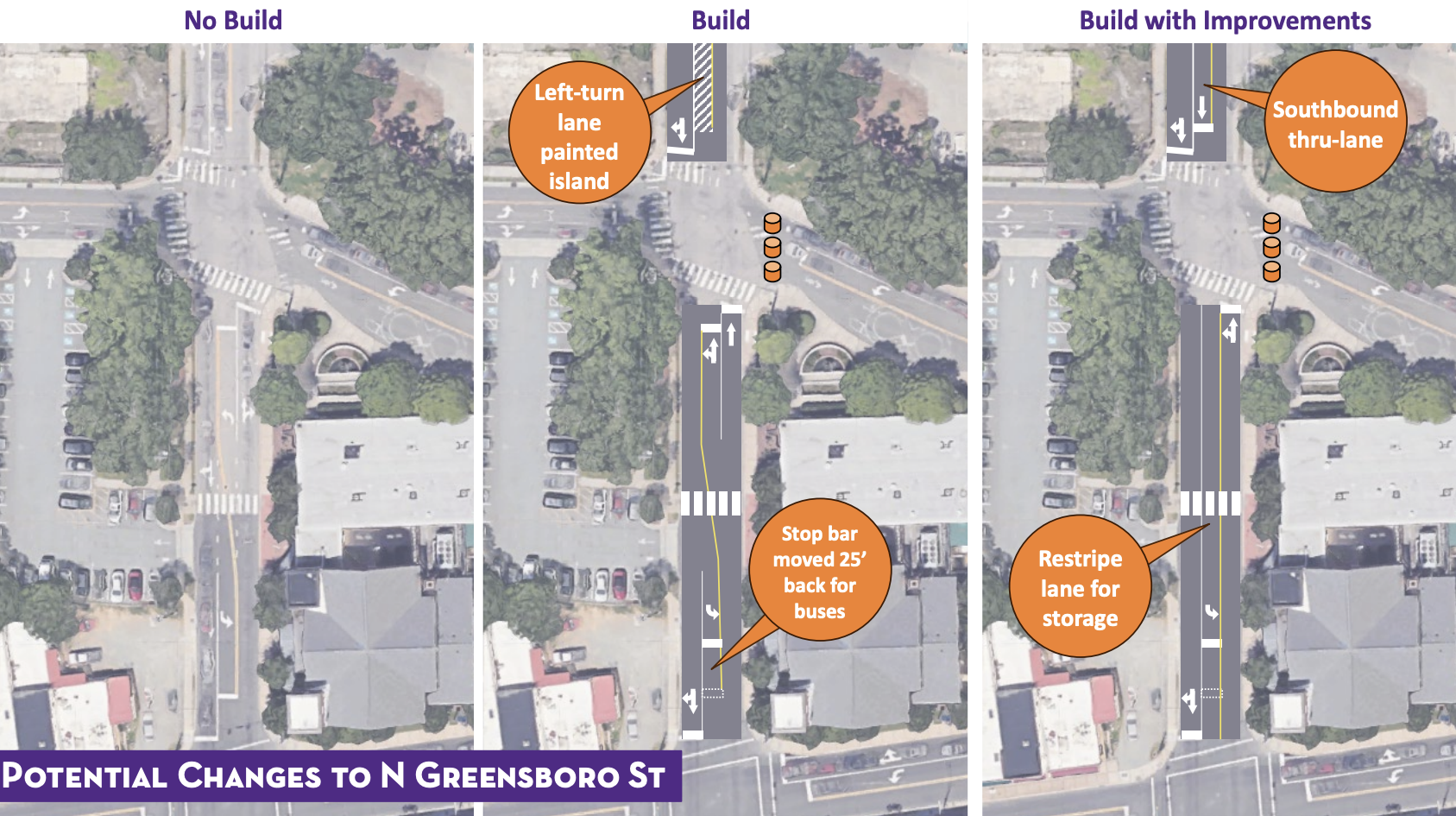 Both build scenarios also feature moving South Greensboro’s stop bar back to give more room to turning Chapel Hill transit buses, as Dodson said the F and CW routes would be rerouted from East Weaver to East Main Street.