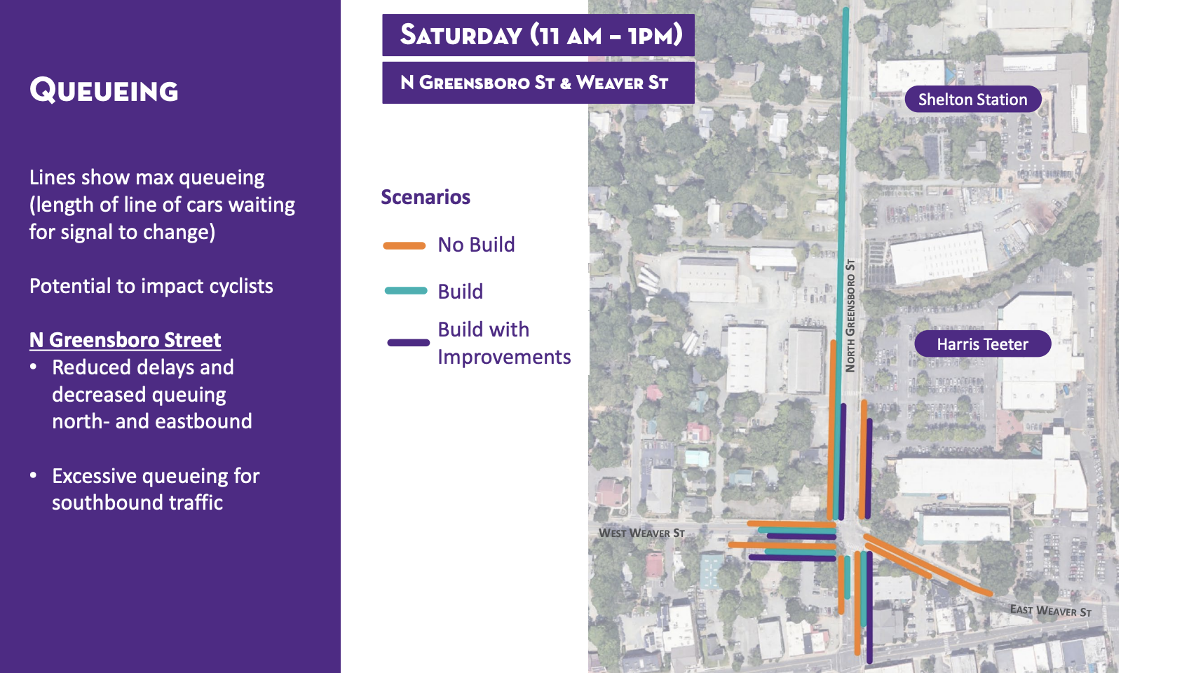 Current queueing at North Greensboro and Weaver streets at peak weekend hours, compared to traffic volume under the town’s potential redesign scenarios. (Image via the Town of Carrboro.)
