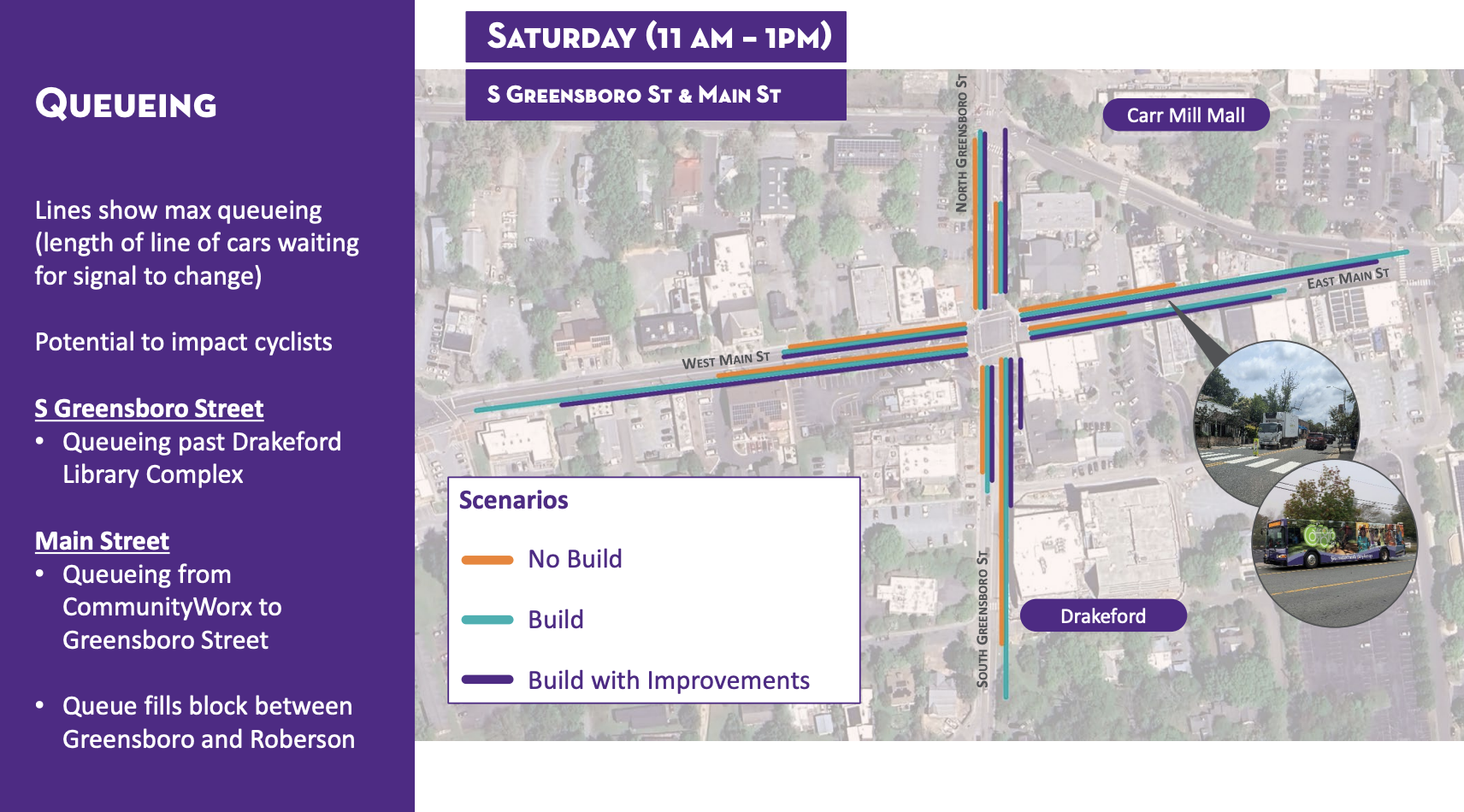 Current queueing at South Greensboro and Main streets at peak weekend hours, compared to traffic volume under the town’s potential redesign scenarios. (Image via the Town of Carrboro.)