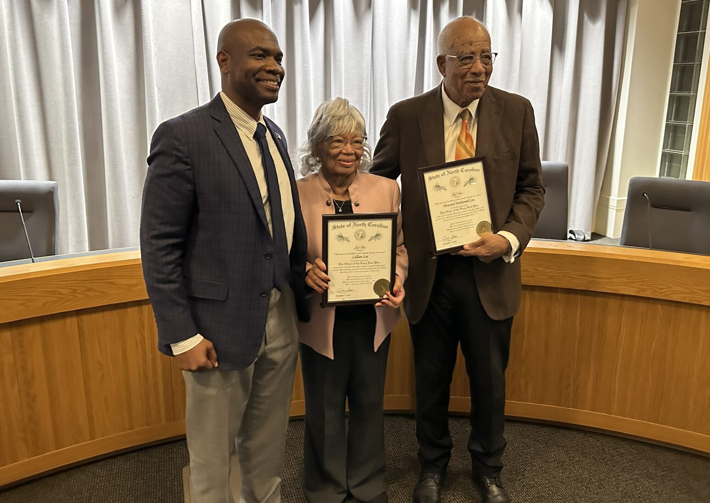 Howard Lee (right) and Lillian Lee (center) hold up their plaques affirming their induction into the Order of the Long Leaf Pine alongside N.C. Rep. Allen Buansi. (Photo by Henry Taylor/Chapel Hill Media Group.)