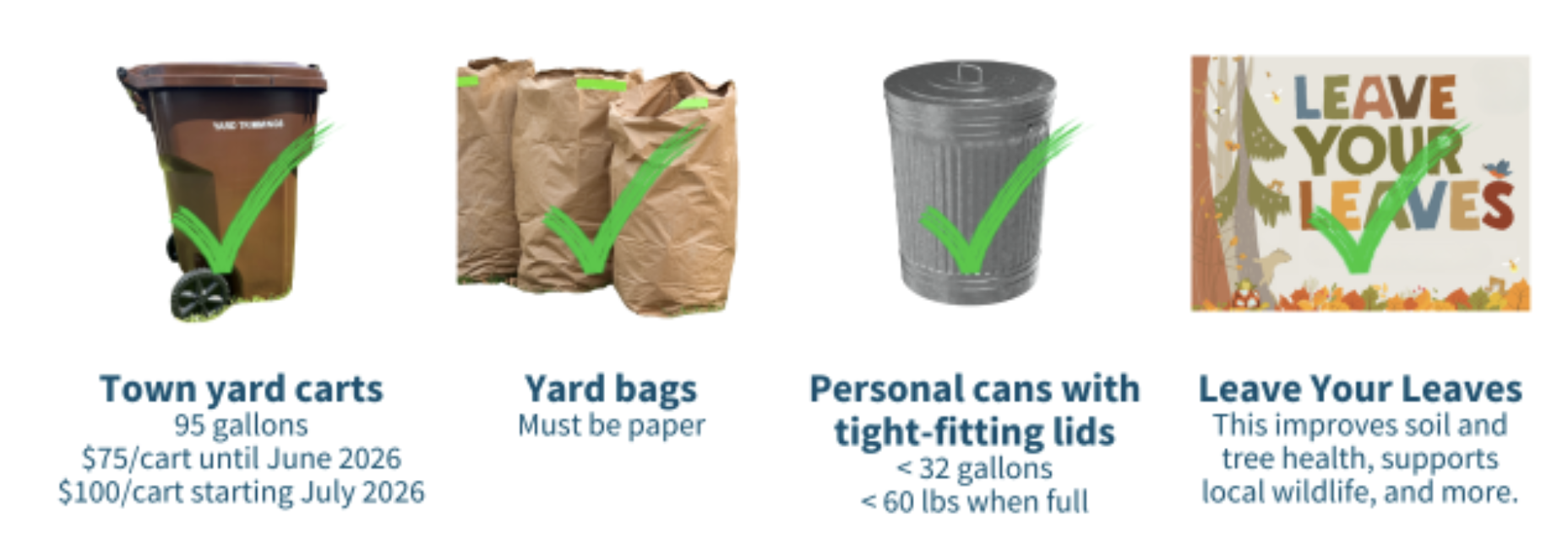The town is now only accepting leaves and yard trimmings in containers like town yard carts, paper yard bags, or personal yard cans with tight-fitting lids. Starting July 1, only the yard carts will be accepted.