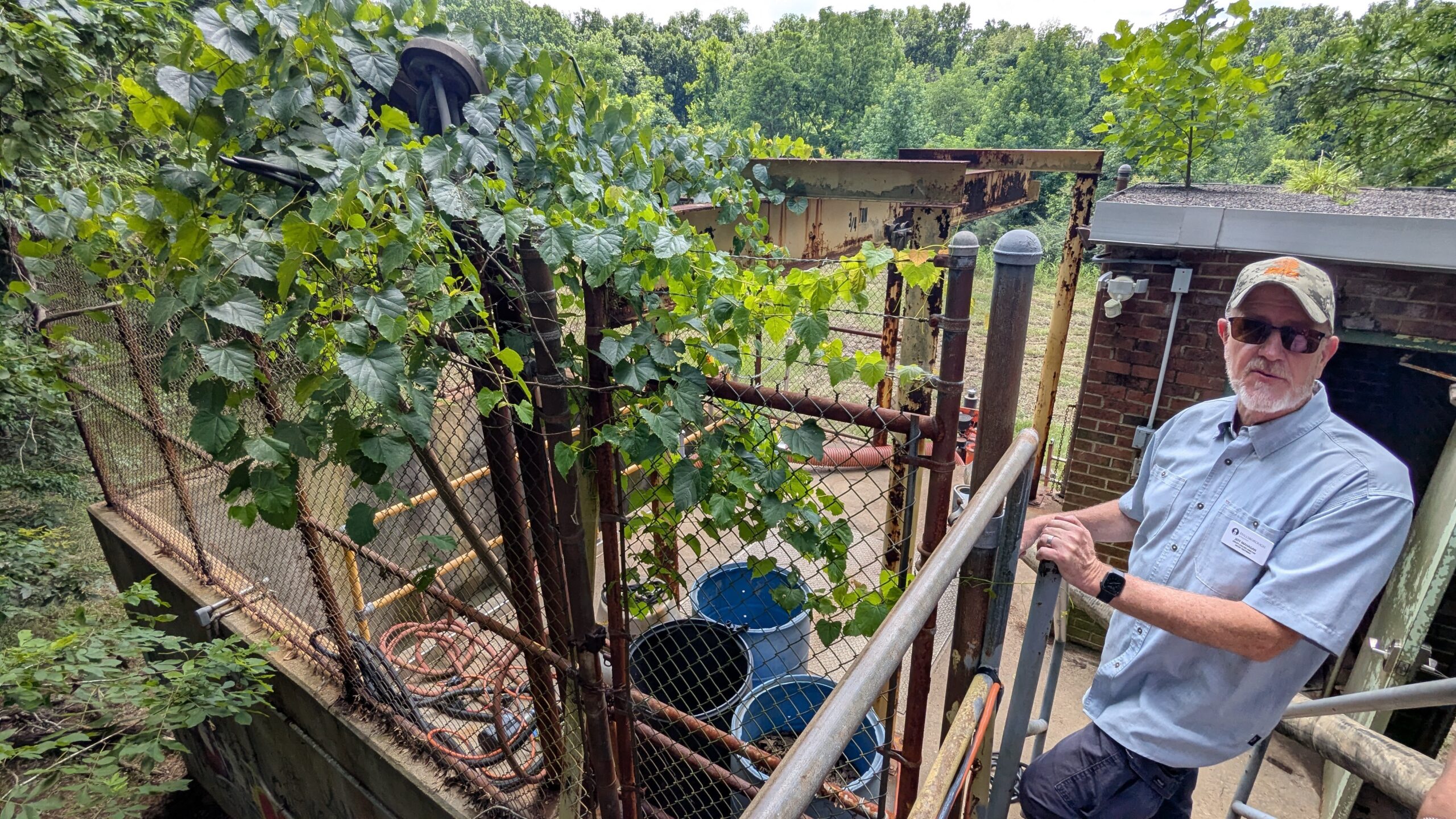 Hillsborough Deputy Utilities Director for Water Treatment Jeff Mahagan stands at the River Pump Station during a brief tour on Friday, July 11 to show the temporary bypass pumps in place and to describe the flood damage. (Photo by Brighton McConnell/Chapel Hill Media Group.)