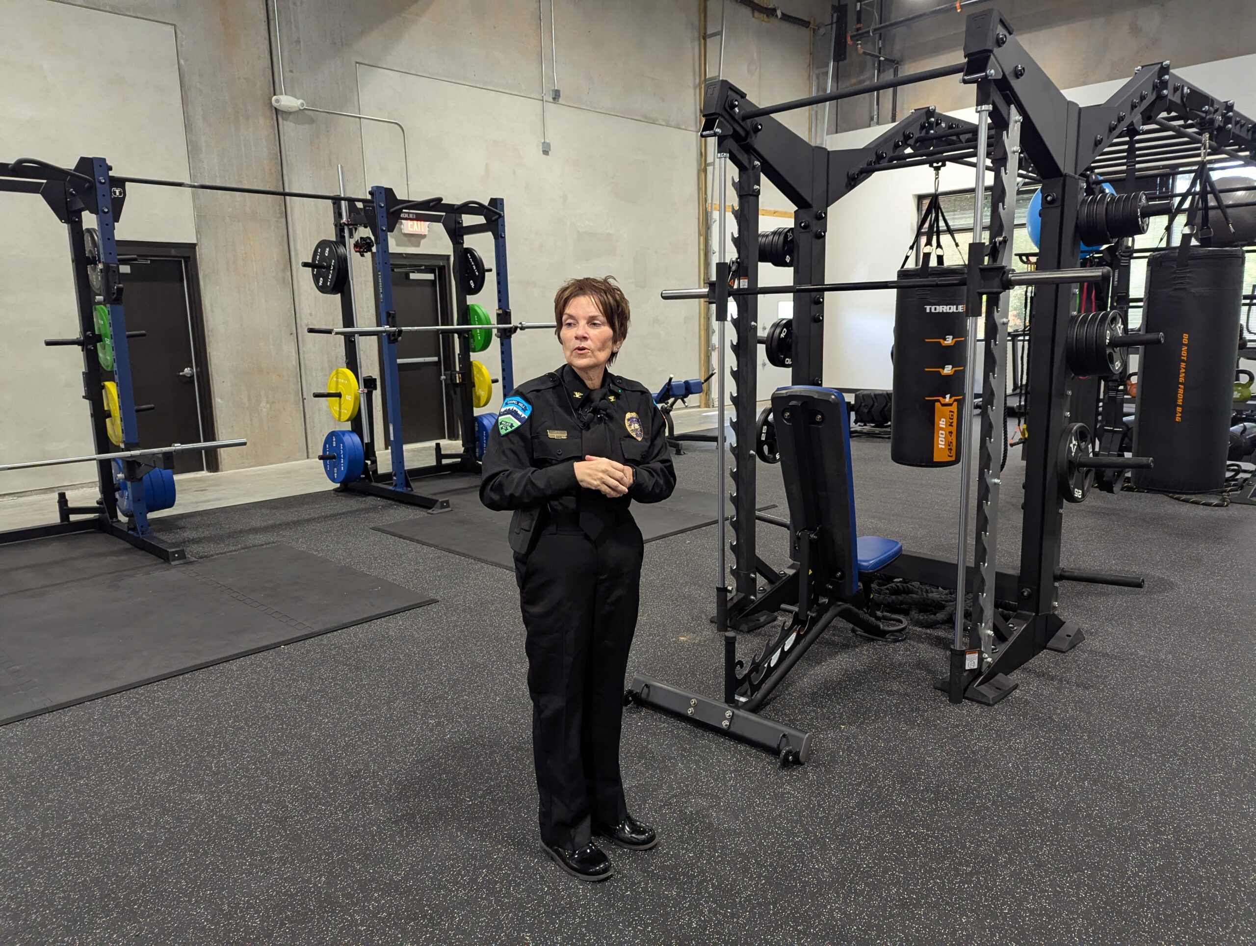 Chapel Hill police chief Celisa Lehew shows off the gym inside the department’s new headquarters on Millhouse Road. (Photo by Aaron Keck/Chapel Hill Media Group.)