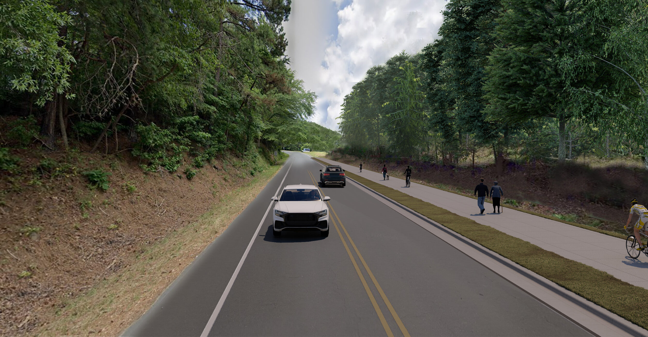 A rendering of the updated Estes Drive Extension design for the stretch from Seawell School Road to the Carrboro town limits at Village Drive. The updated design features a wider multi-use path for both bicycle and pedestrian traffic on the south side of the road. (Image via the Town of Chapel Hill.)