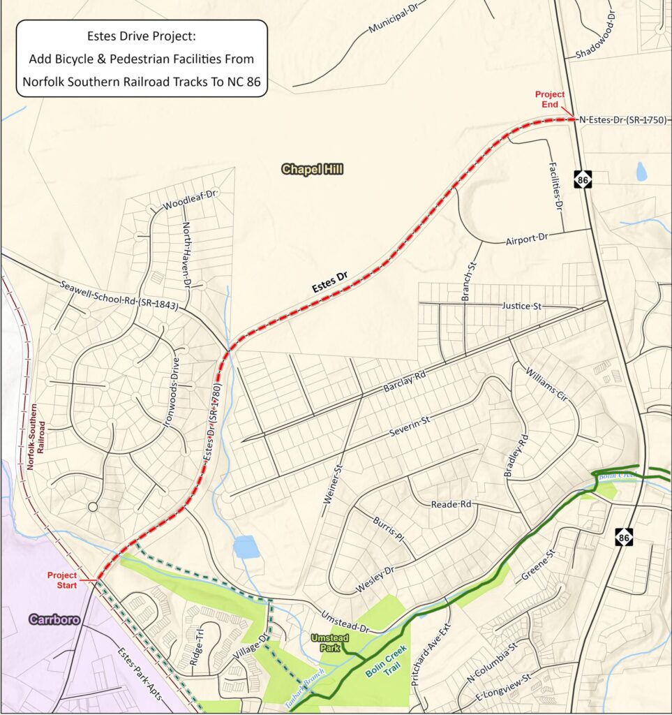 With Estes Drive’s bicycle and pedestrian improvements having been finished in 2024, the Town of Chapel Hill’s focus has shifted to adding similar infrastructure to Estes Drive Extension – which runs from Martin Luther King Jr. Boulevard to Carrboro’s town limits. While a design was approved last fall, changes were recently made after town staff received updates from the North Carolina Department of Transportation.