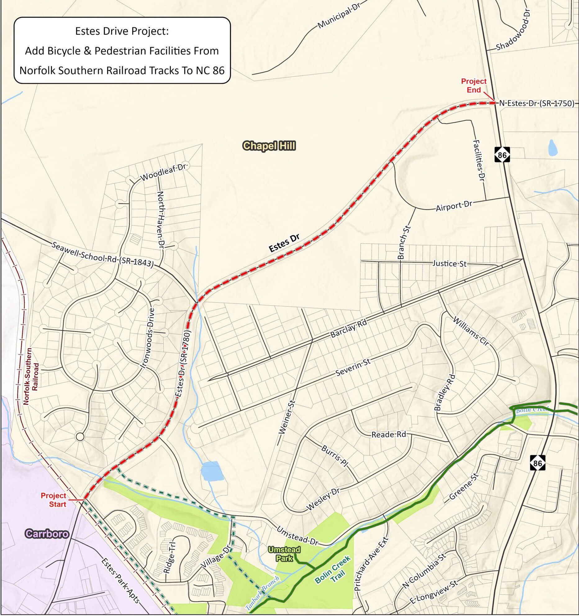 NV5 is working with Chapel Hill to design another ongoing multi-modal infrastructure project: the Bolin Creek Greenway extension, which aims to take the greenway north from Umstead Park and eventually connect to the future multi-use path on Estes Drive Extension. The project just finished a brief public comment period before starting the final planning phases and construction. Both efforts are examples, Anderson said, of Chapel Hill’s work to improve connectivity of the community through methods other than vehicle traffic.