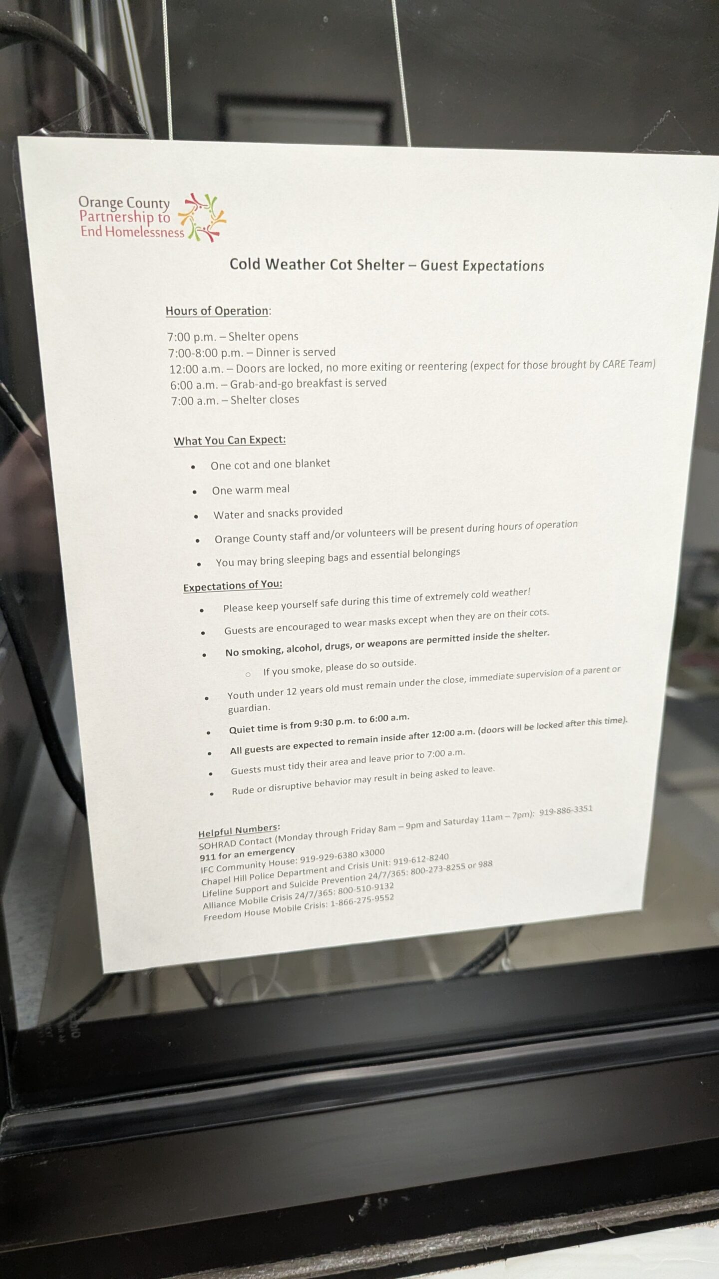 While the system to run the county’s cold weather shelter is well-established, that doesn’t mean it isn’t without challenges. For now, volunteers are only using microwaves left over from when the police department moved out of the 828 MLK building – and are limited to how many can run at once without blowing the fuse. The county also had to shut down the Hillsborough shelter it added in a partnership with two churches this winter. While they weren’t seeing enough traffic to justify staying open, staff know the need is still there and say the lack of takers speaks more to people’s struggles traveling to and from that part of Orange County.