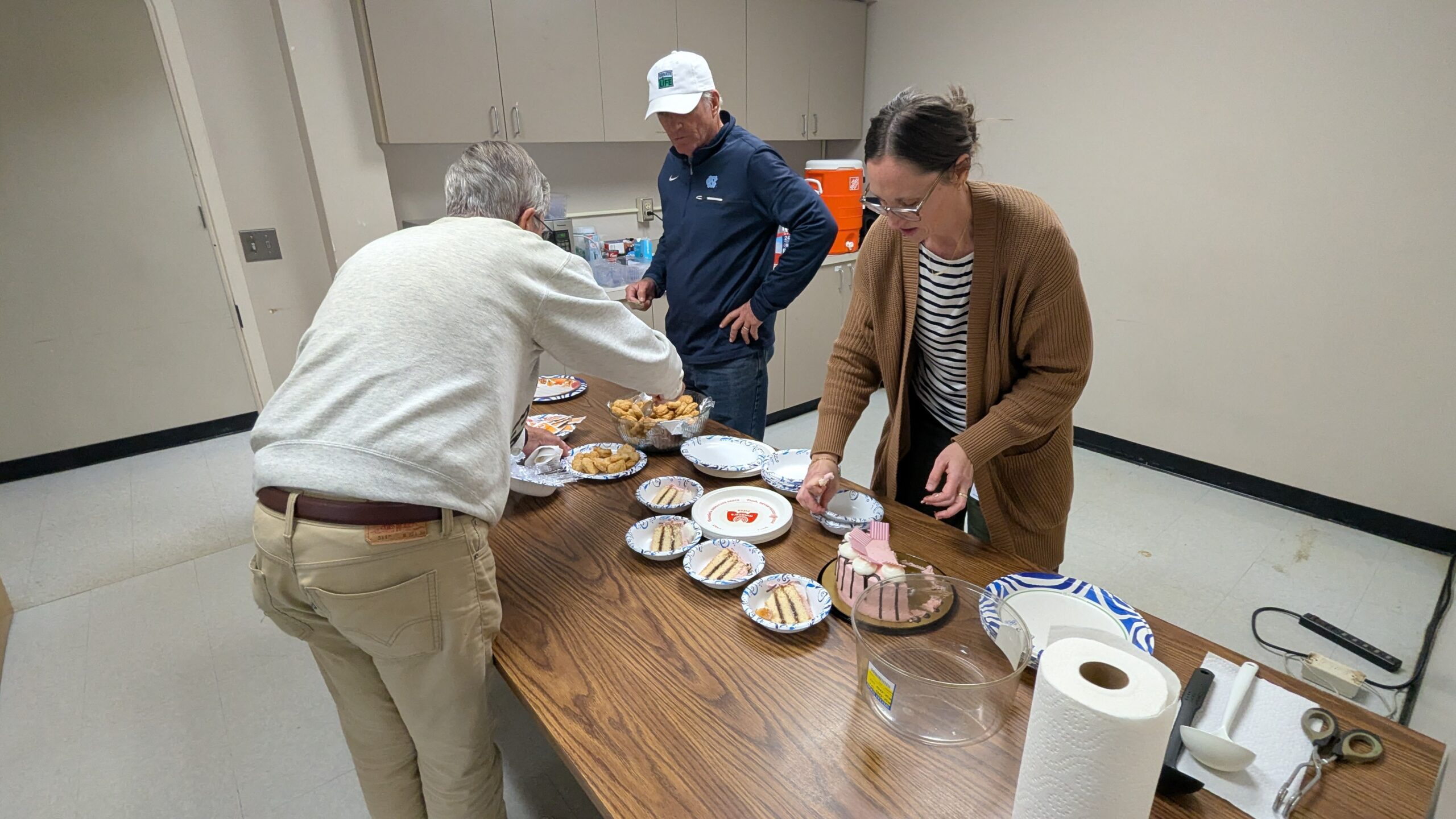 From right to left: Heather Pack Apointe, Mike Fox and Joe Bray prepare some of the food they will pass out to people who present at the shelter. (Photo by Brighton McConnell/Chapel Hill Media Group.)