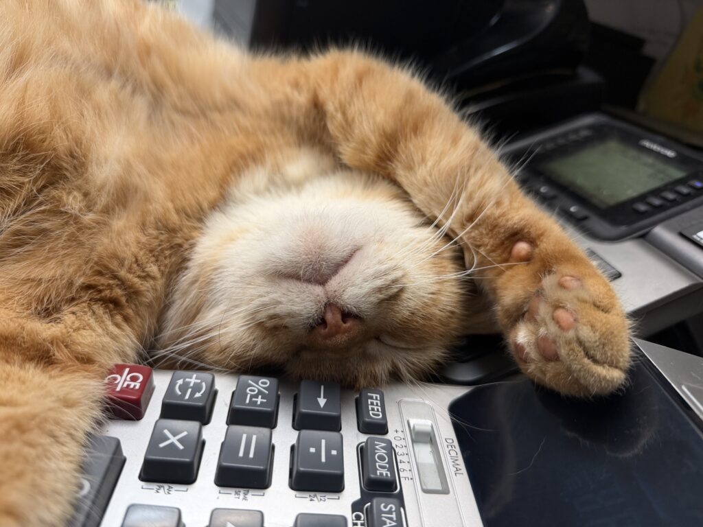 One of Hoover’s favorite nap spots is right on top of the calculator used by front desk workers at the Oriental Marina & Inn.