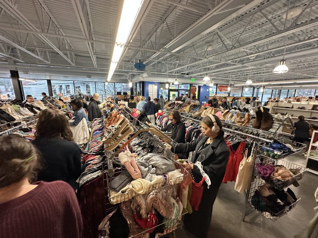 Shoppers explore Extraordinary Thrift Store’s expanded clothing section following the ribbon cutting. (Image via Henry Taylor/Chapel Hill Media Group)