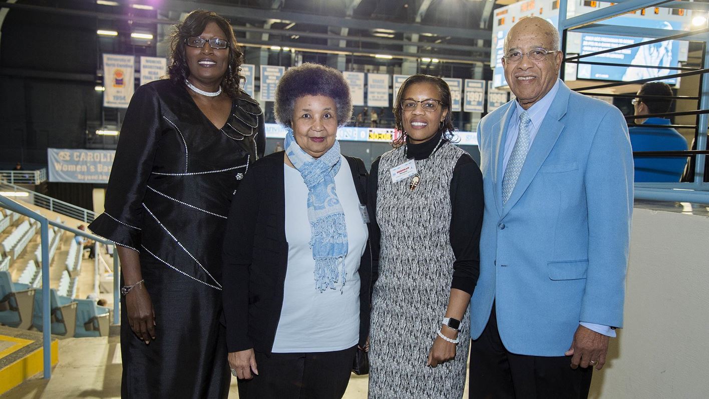 Edith Wiggins, second from the left, stands with Tresa Brown, Deborah Stroman and Howard Lee as they were honored at a UNC women’s basketball game in 2018. (Photo via Carolina Athletics/Jeffrey A. Camarti)