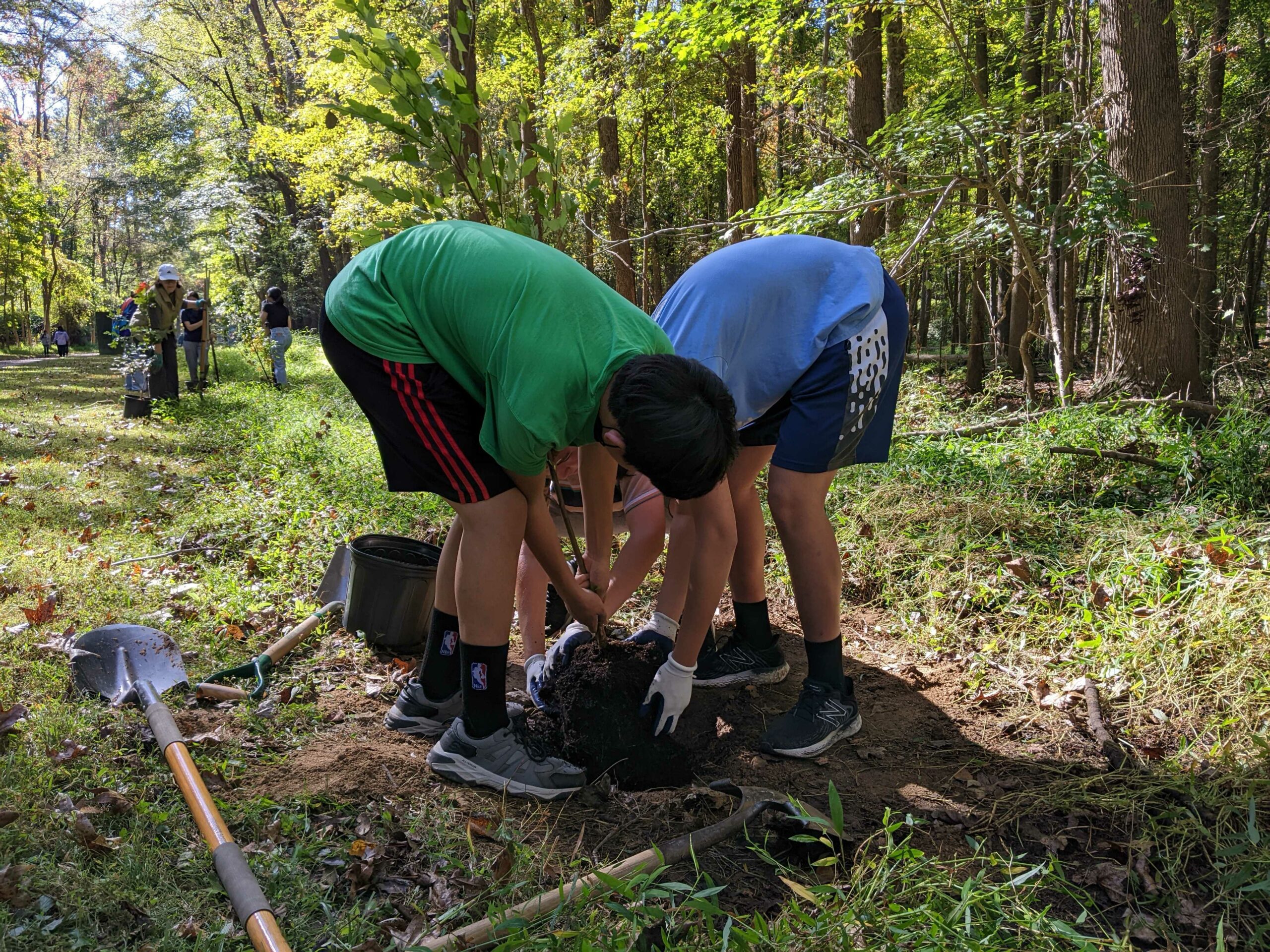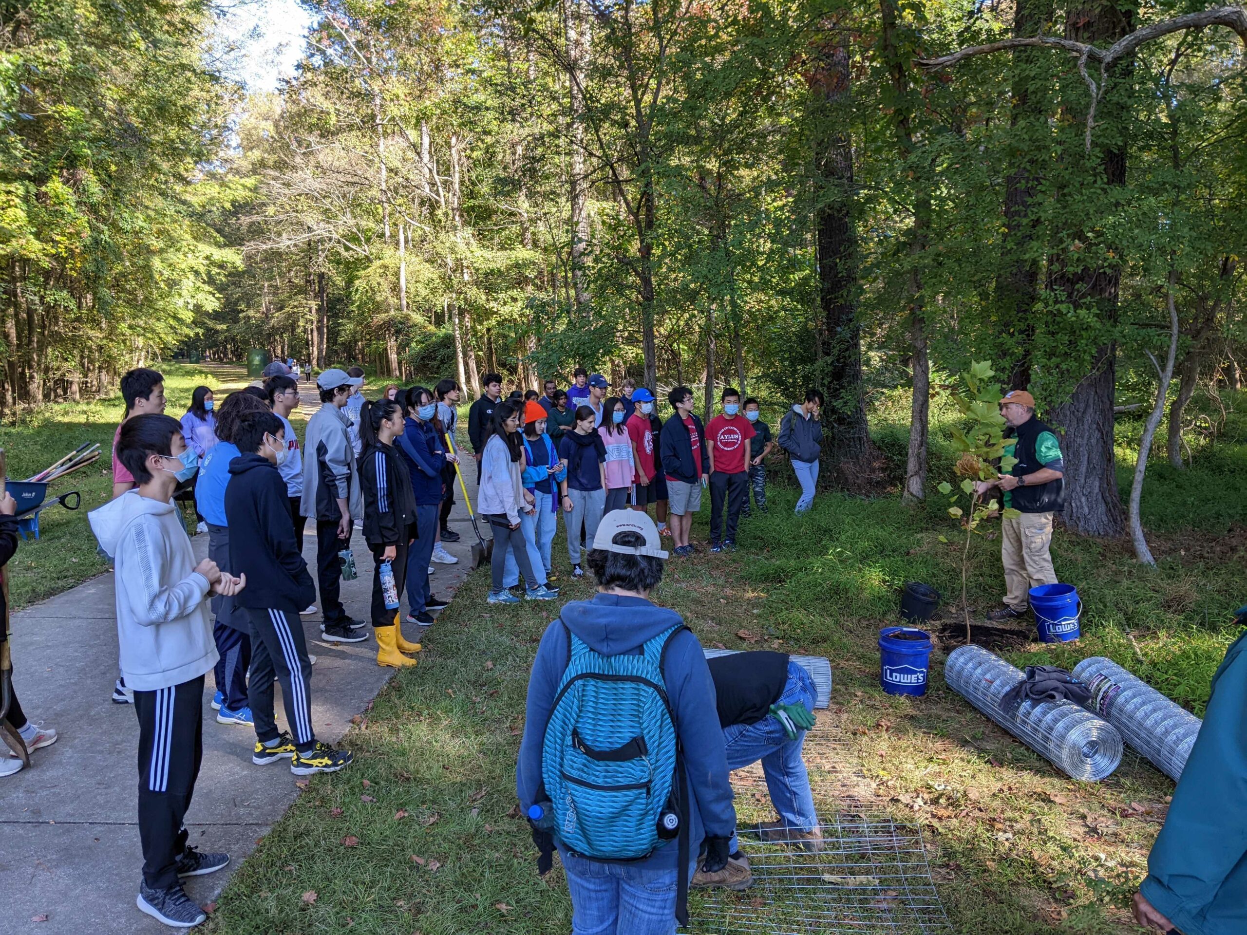 It’s a beautiful fall morning in Chapel Hill, with people gathering along the Booker Creek Trail for the first volunteer trail day of the fall. Dozens of middle schoolers, high schoolers and adults are standing around Adam Smith of the Parks and Recreation Department as he demonstrates the proper ways to plant young trees.