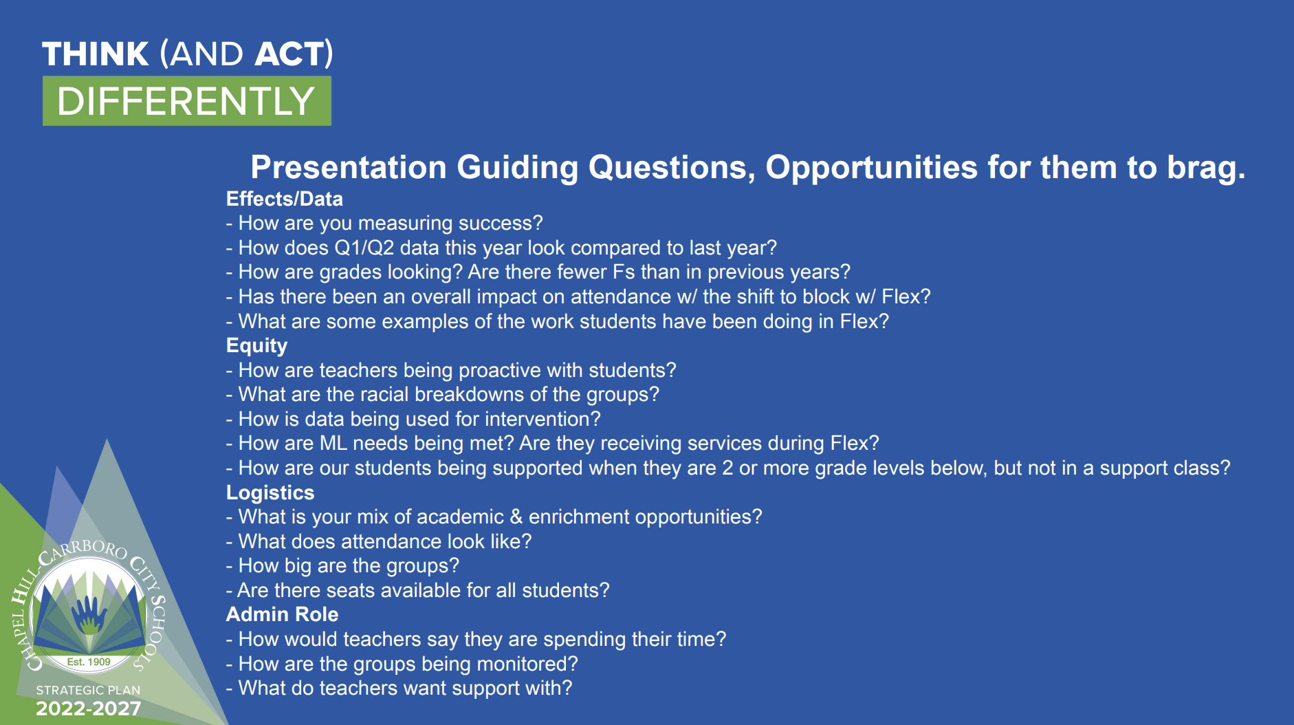 Guiding questions for each school’s flex team to answer at the end of the semester. The presentations aim to identify what flex models are working and what needs improvement. (Photo via Chapel Hill-Carrboro City Schools.)