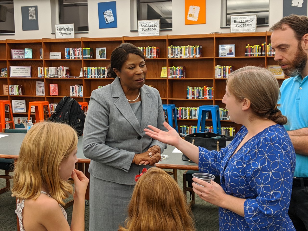 Orange County Schools superintendent Dr. Monique Felder talks with a family after her official selection to lead Orange County Schools in 2019. When she joined the district, Felder credited its recently-adopted equity policy as being a key factor to her interest. During her tenure, Orange County Schools reported significant improvements in academic growth, early-elementary literacy, and the four-year graduation rate.
