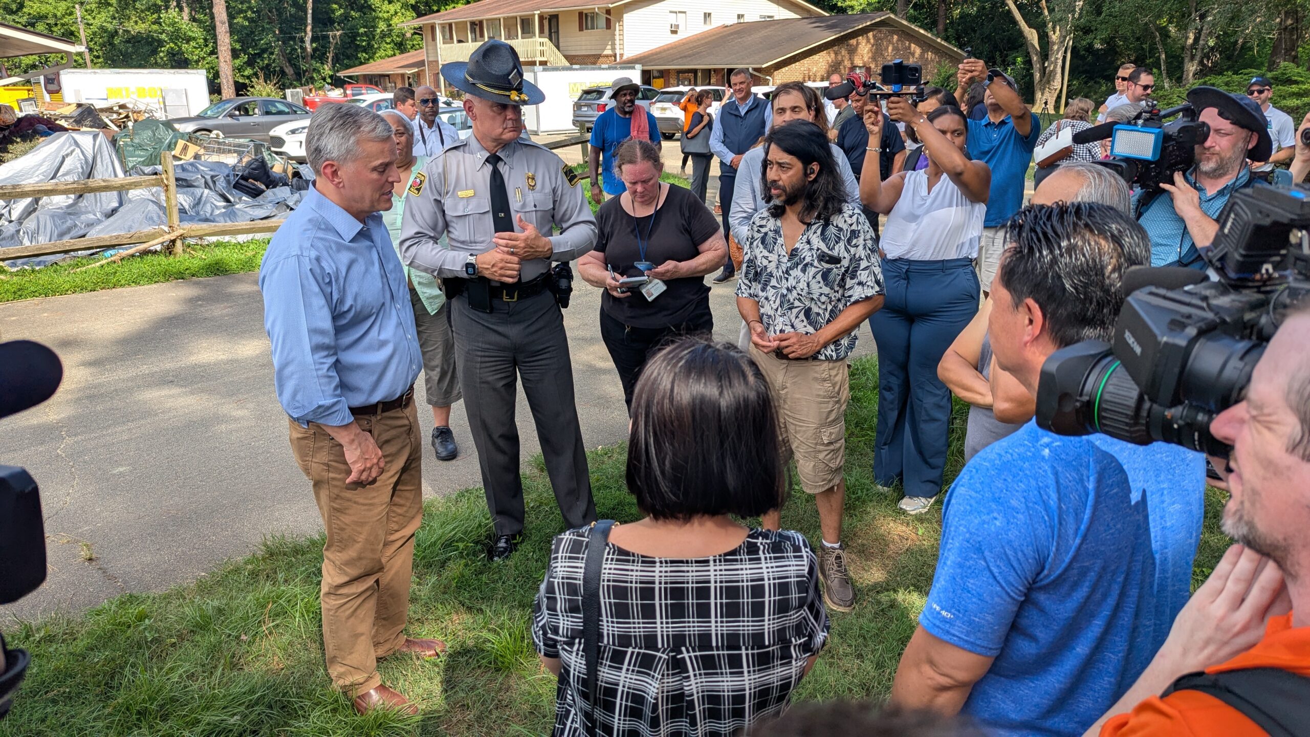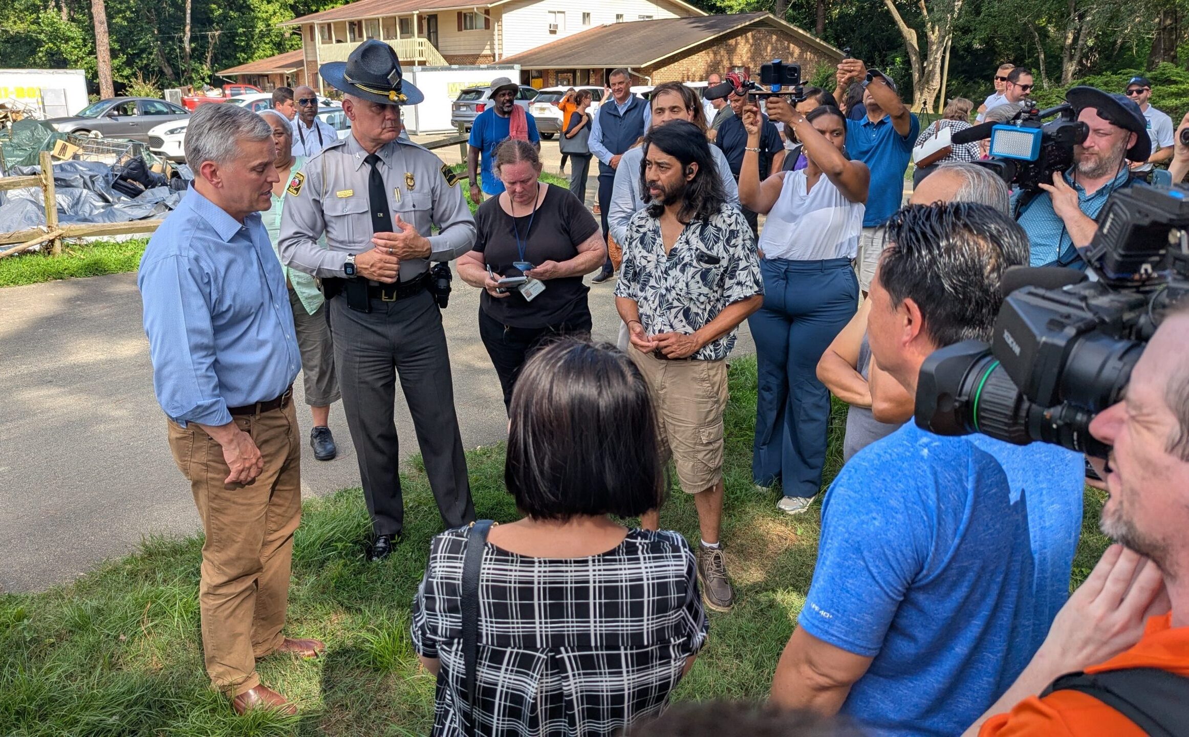 “Whether you have a storm like Helene,” the governor responded, “or whether you have a storm like Chantal that may hit ten counties in a fairly localized way, if it’s your home, it doesn’t matter if you’re one of ten or one of a million. Your life has been turned completely upside down. And what we have to do is everything in our power to help folks get back on their feet — whether it’s the homeowners in this complex, the property owners, the small business owners at Eastgate…or helping the towns of Carrboro and Chapel Hill, which lost millions of dollars worth of equipment and property.