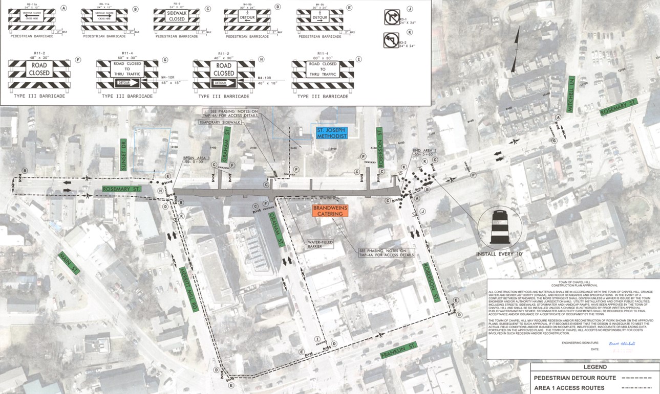 The map for Phase 1 of closures along West Rosemary Street for the water main replacement, with the dotted lines showing different detours and access points for the work site in Chapel Hill. (Photo via OWASA/DRMP.)
