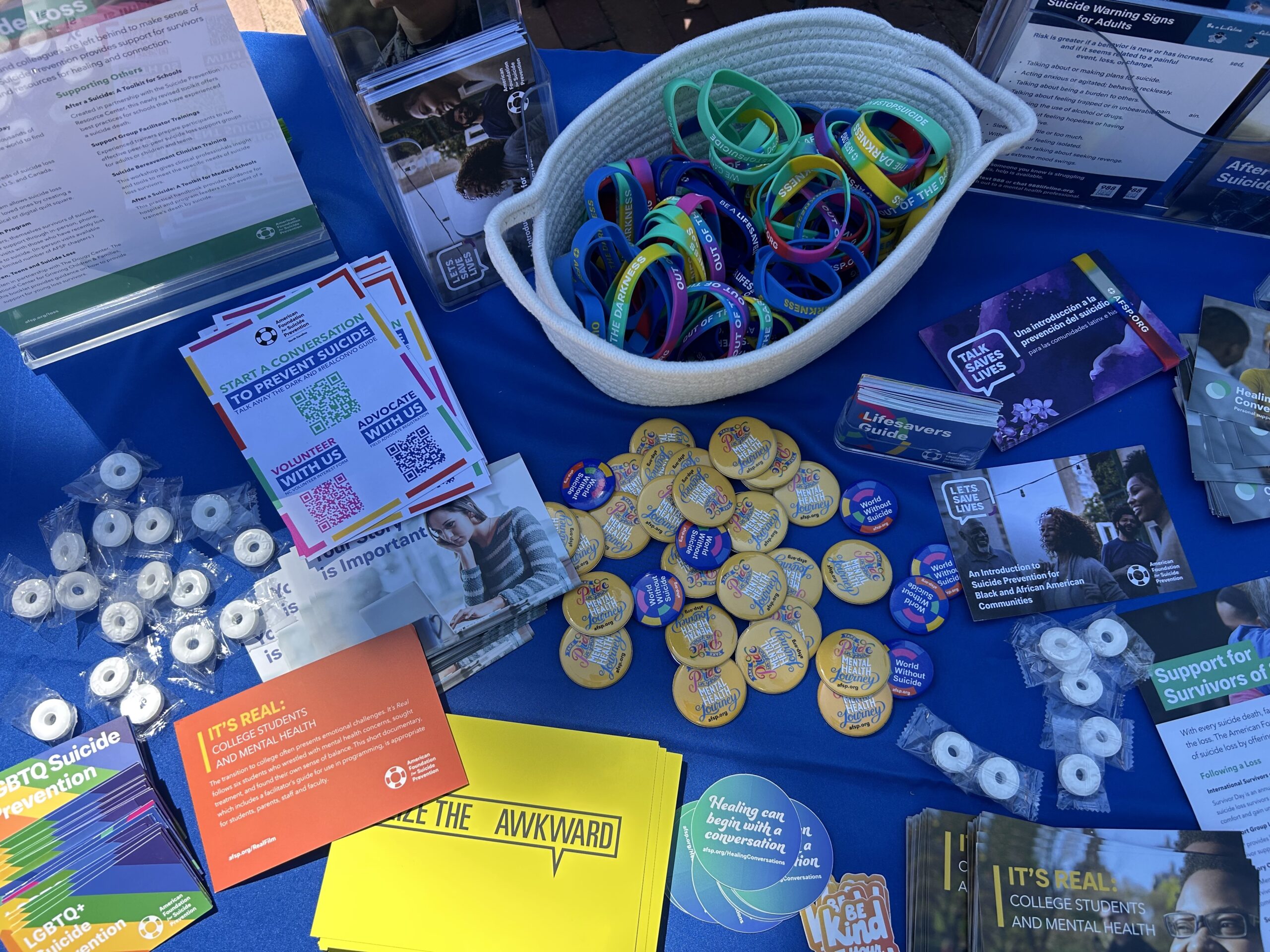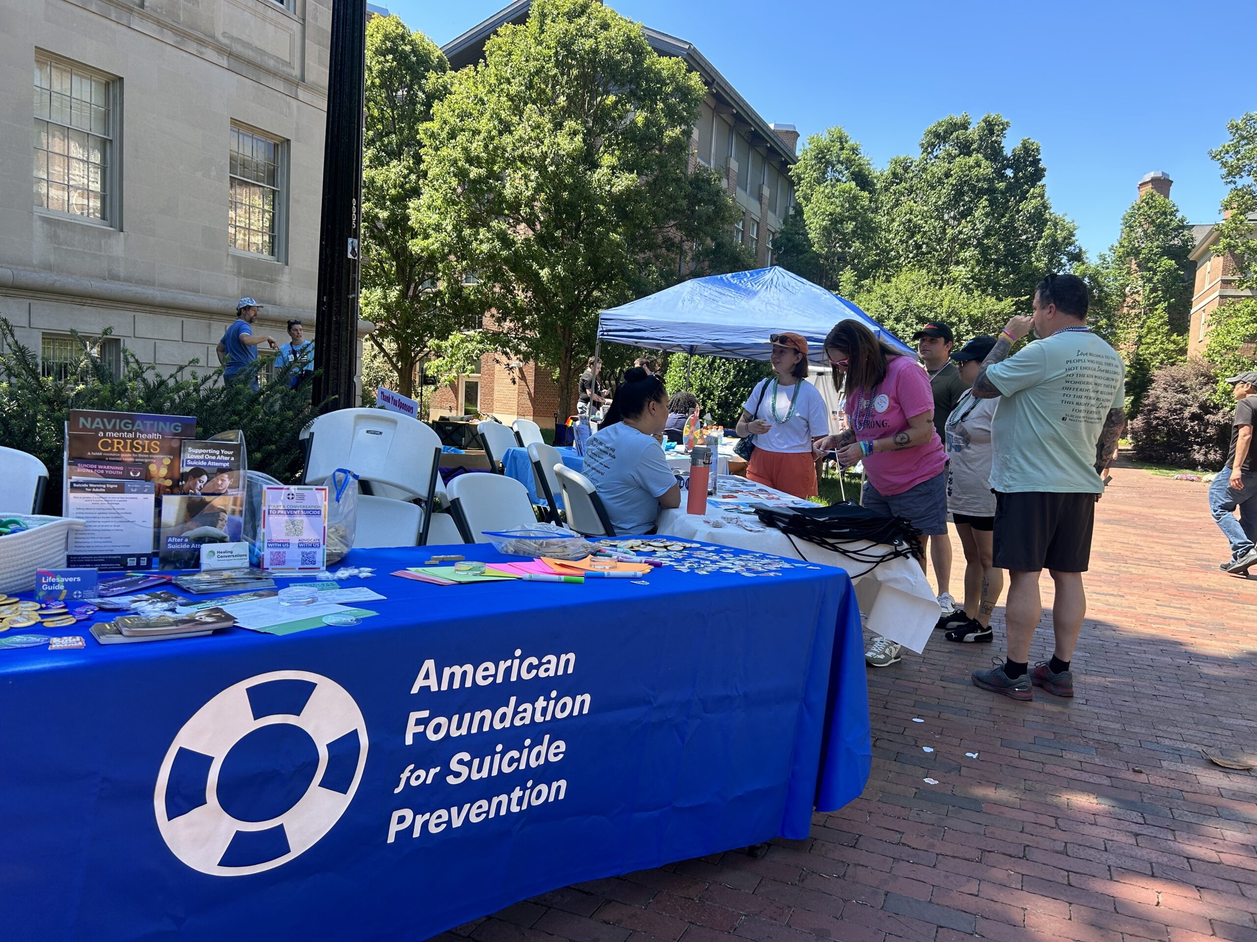The Out of the Darkness Walk at Polk Place shared mental health resources from organizations like UNC Suicide Prevention Institute, UNC Family Medicine, NAMI Orange County, and The Scrap Exchange. (Photo by Emma Cooke/Chapel Hill Media Group.)