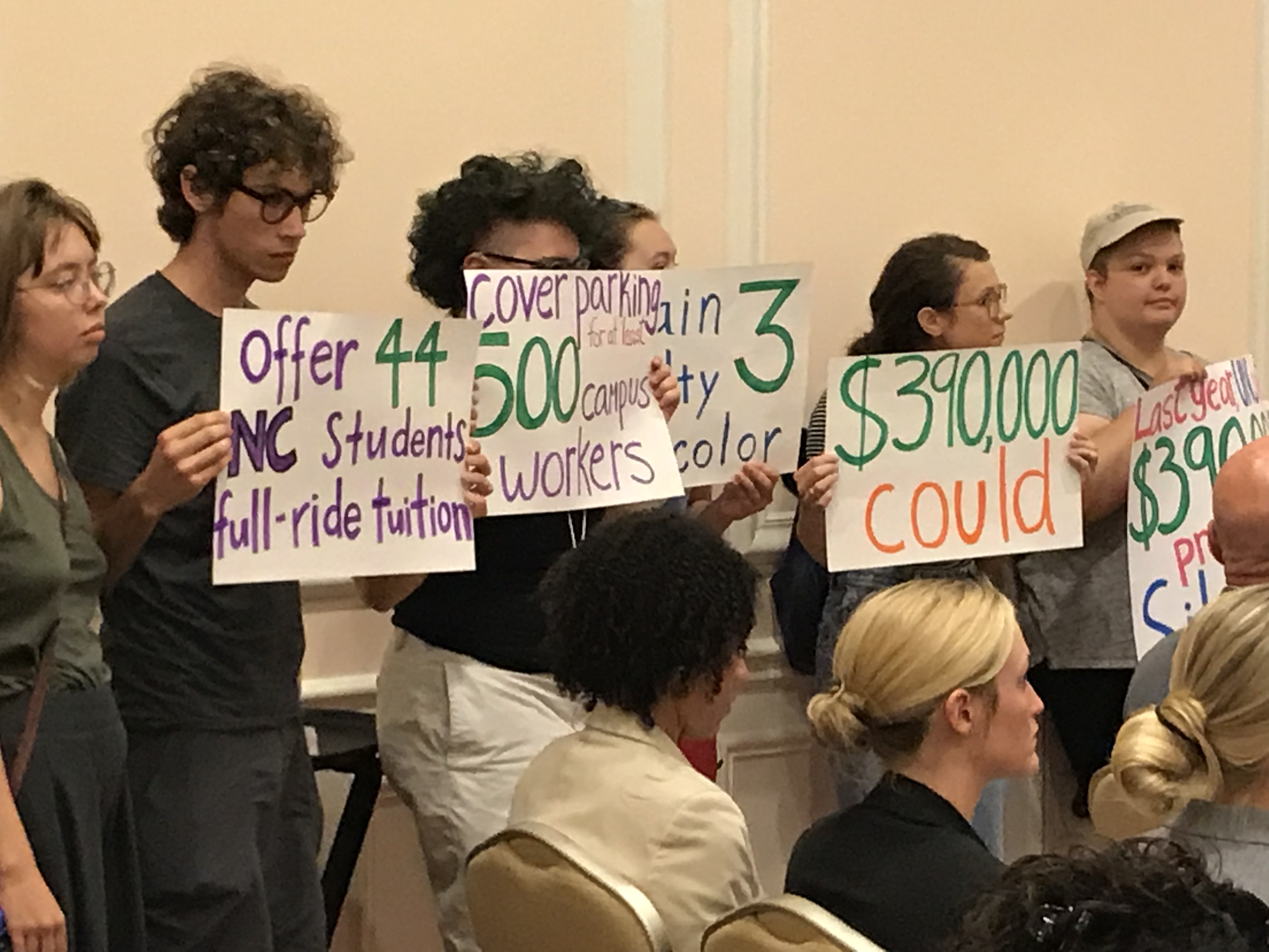 Protesters at UNC Board of Trustees committee meeting. Photo via Blake Hodge.