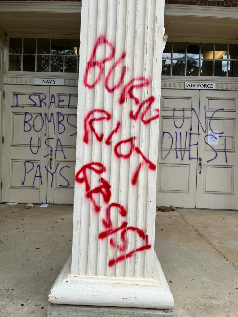 Some recent pro-Palestine demonstrations have resulted in student arrests and vandalism as well. In April, a group of SJP demonstrators violated university policy by putting up tents on the Polk Place quad and accessing academic buildings overnight. Police arrested 36 people over the incident, which sparked a larger demonstration and saw a clash between protestors and police once people removed the U.S. flag in favor of a Palestinian flag. In May, a group of demonstrators poured red paint on the steps of South Building and its doors in the hours before UNC’s commencement ceremony. No charges have been publicly announced by the university regarding that vandalism.