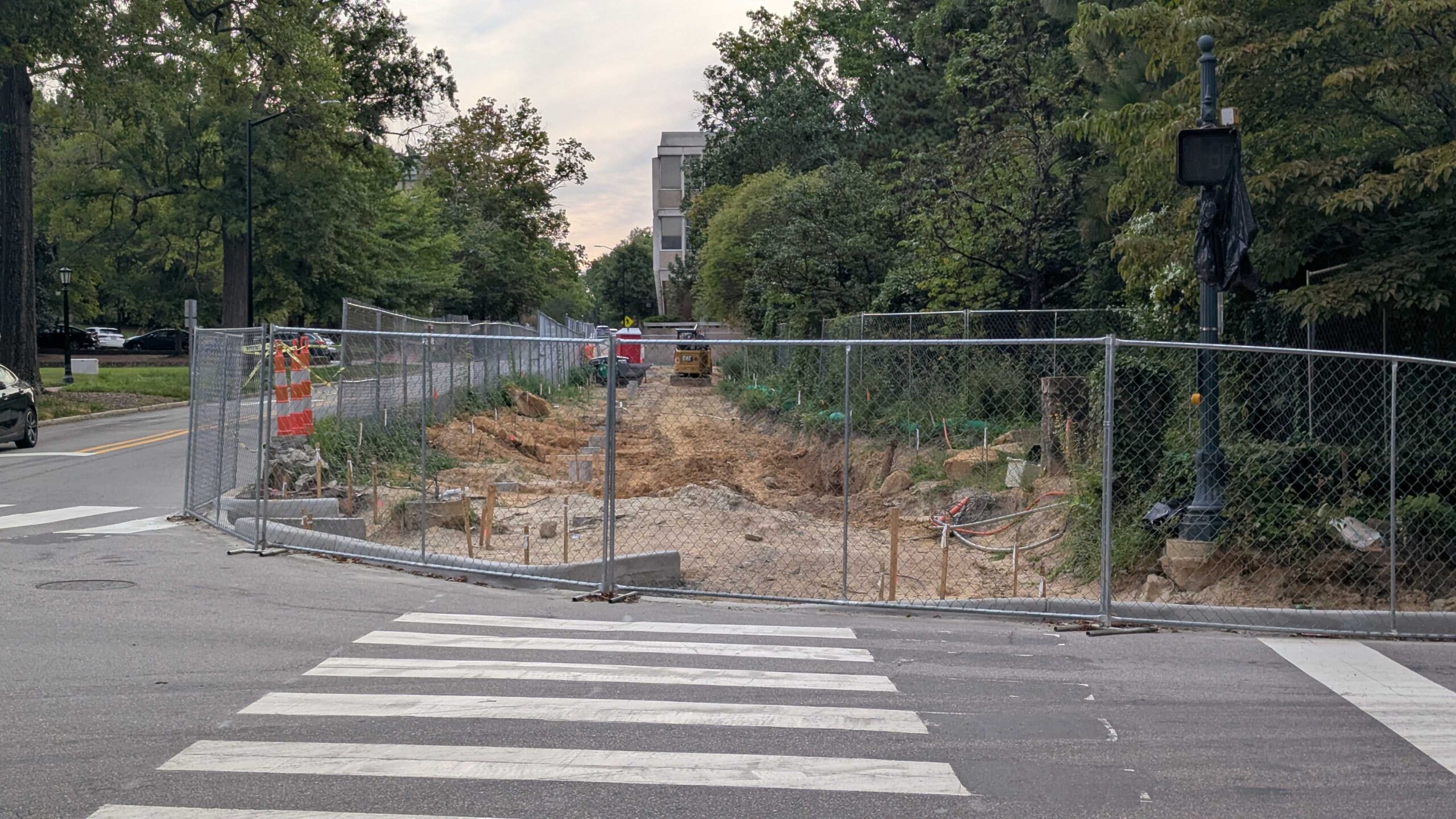 The view looking west down Cameron Avenue and the site of the Coker Arboretum arbor on Tuesday, Aug. 26, 2025. Like before, the entrance to the arbor is expected to be level with the intersection’s sidewalk. (Photo via Brighton McConnell/Chapel Hill Media Group.)