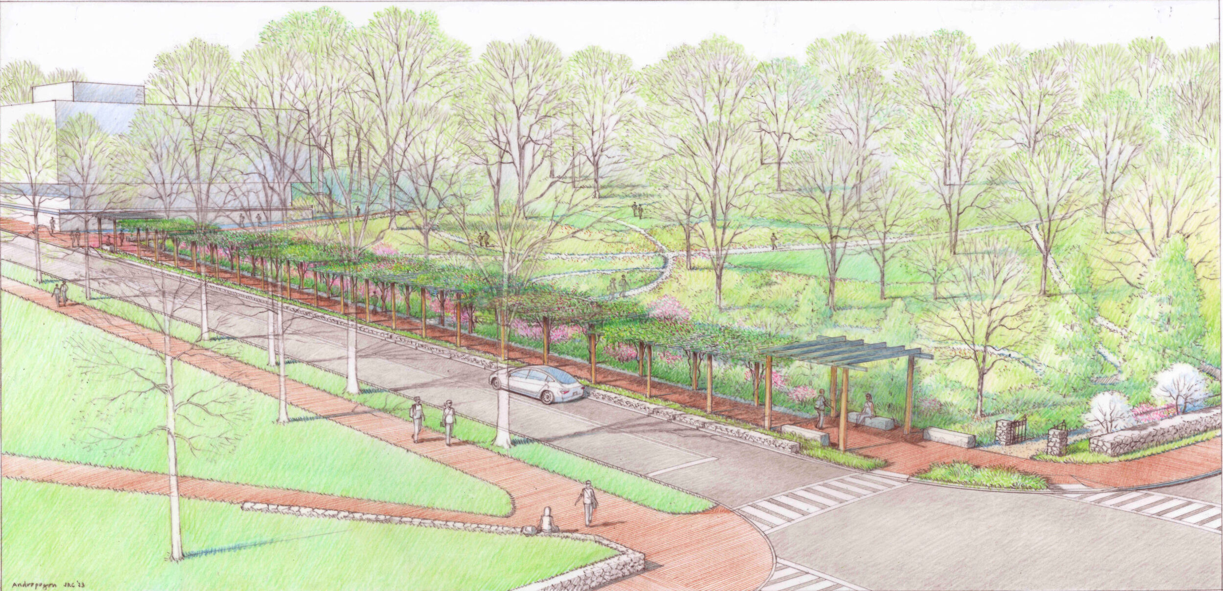 The latest rendering of the potential new arbor design for the Coker Arboretum, as shared by UNC and the North Carolina Botanical Garden. (Photo via UNC/Andropogon Associates.)