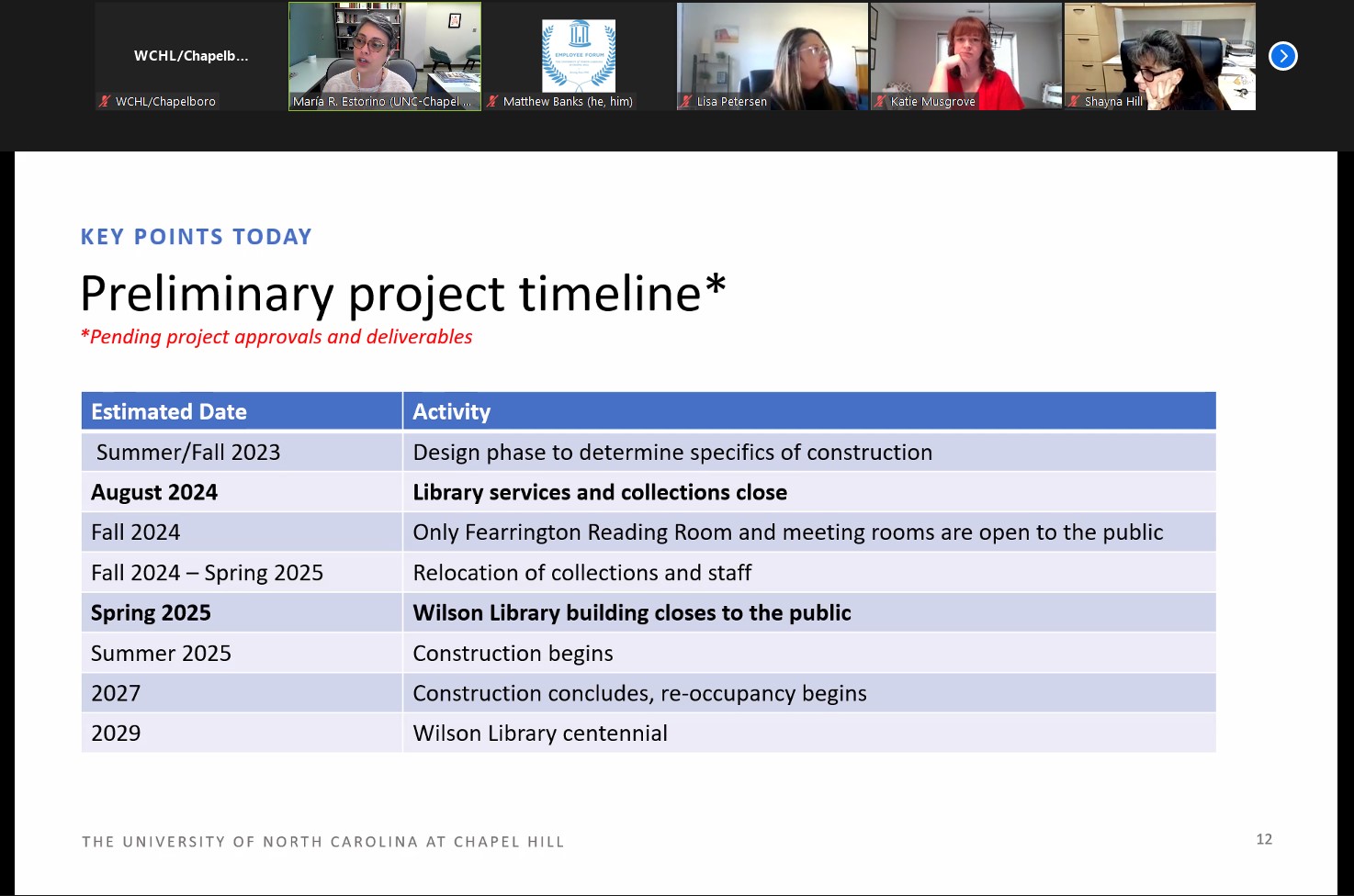 An anticipated timeline for the Wilson Library renovations as of November 2023, which were presented to the UNC Employee Forum over Zoom by María Estorino.