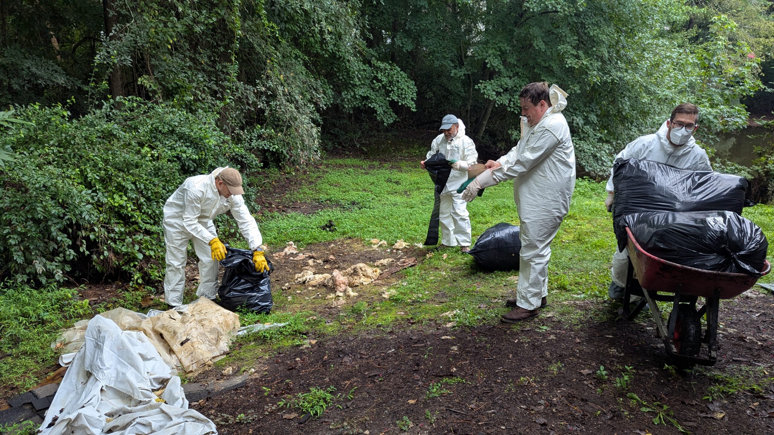 As light rain fell Saturday morning, a quartet of men in white disposable coveralls shoveled wet insulation into trash bags outside of homes in Carrboro’s Weatherhill Pointe. The group carried the debris torn out by either last month’s floods or the ensuing restoration work to a nearby trailer, tossing it onto a tall stack of bags set to be hauled out of the community.