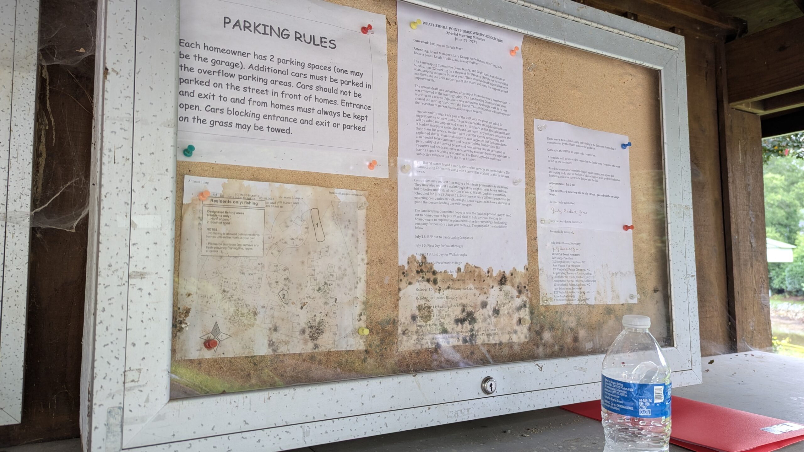The community message board, which sits above the neighborhood’s mailboxes, is the clearest place demonstrating how high the water rose during the July 6 storm. (Photo by Brighton McConnell/Chapel Hill Media Group.)