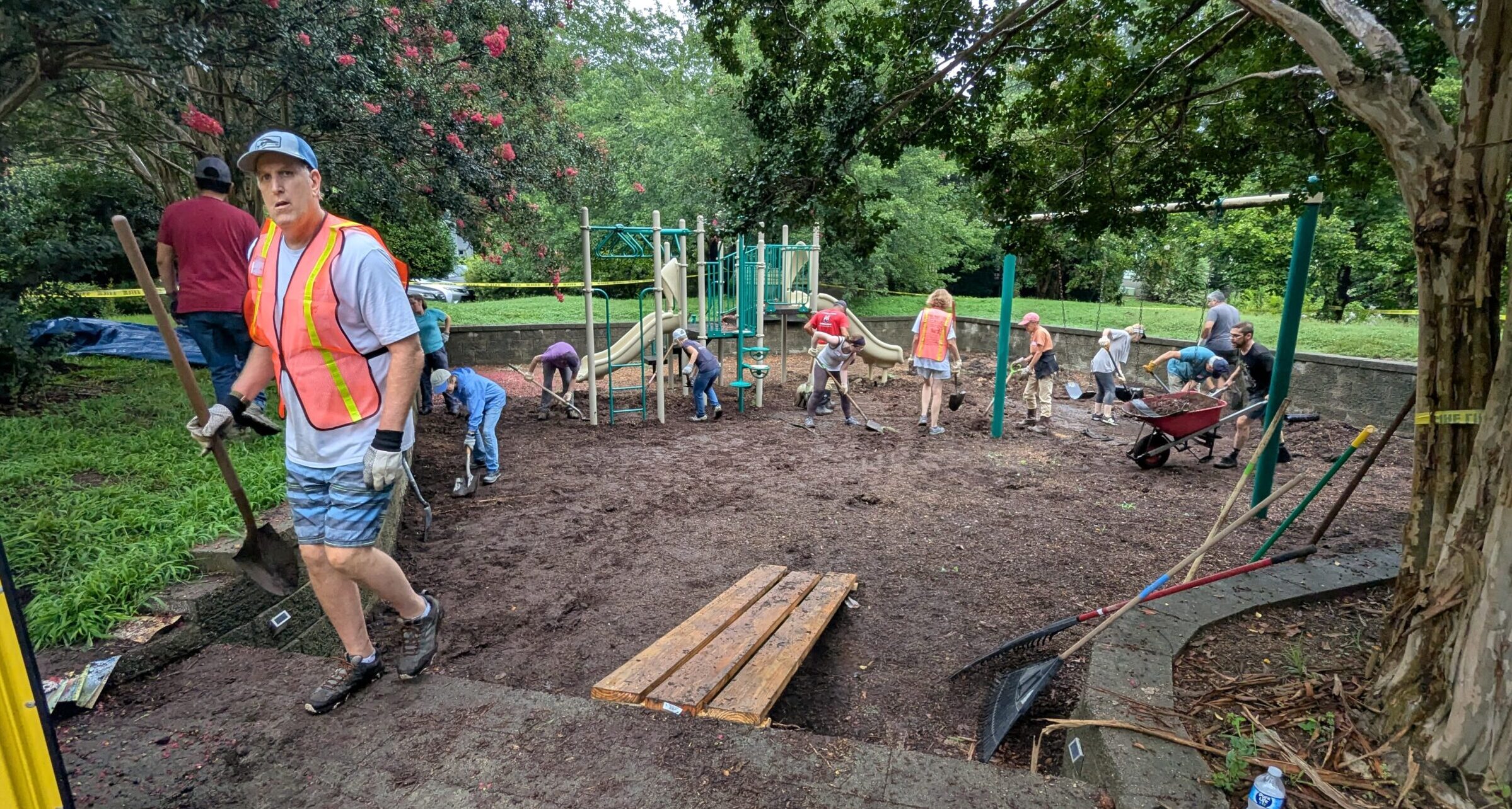 Volunteer Robert Bradford steps out of the Weatherhill Pointe playground after shoveling mulch and dirt out with other volunteers. (Photo by Brighton McConnell/Chapel Hill Media Group.)