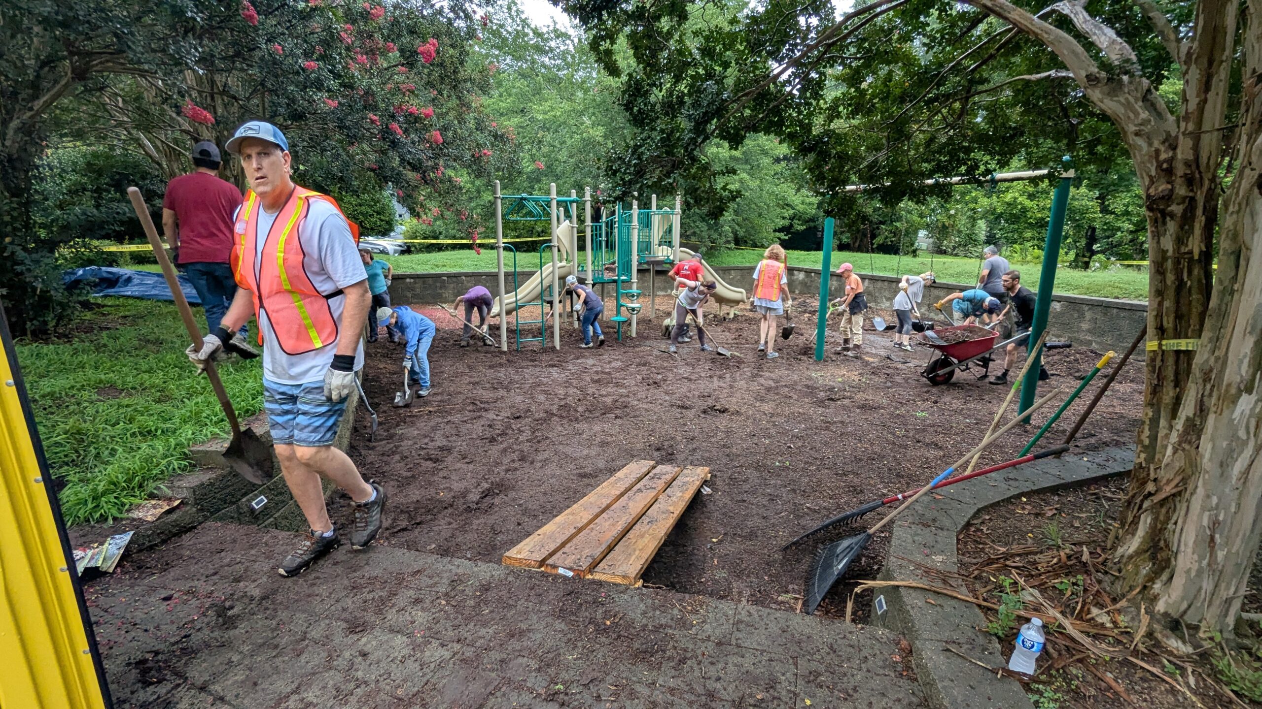 Just down the road, an even bigger group of people teamed up to dig out mulch from the community playground. The equipment sits near Weatherhill Pointe’s mailboxes – with its announcement board six feet off the ground still showing a molded water line of how high Tropical Depression Chantal’s floodwaters reached the night of July 6.