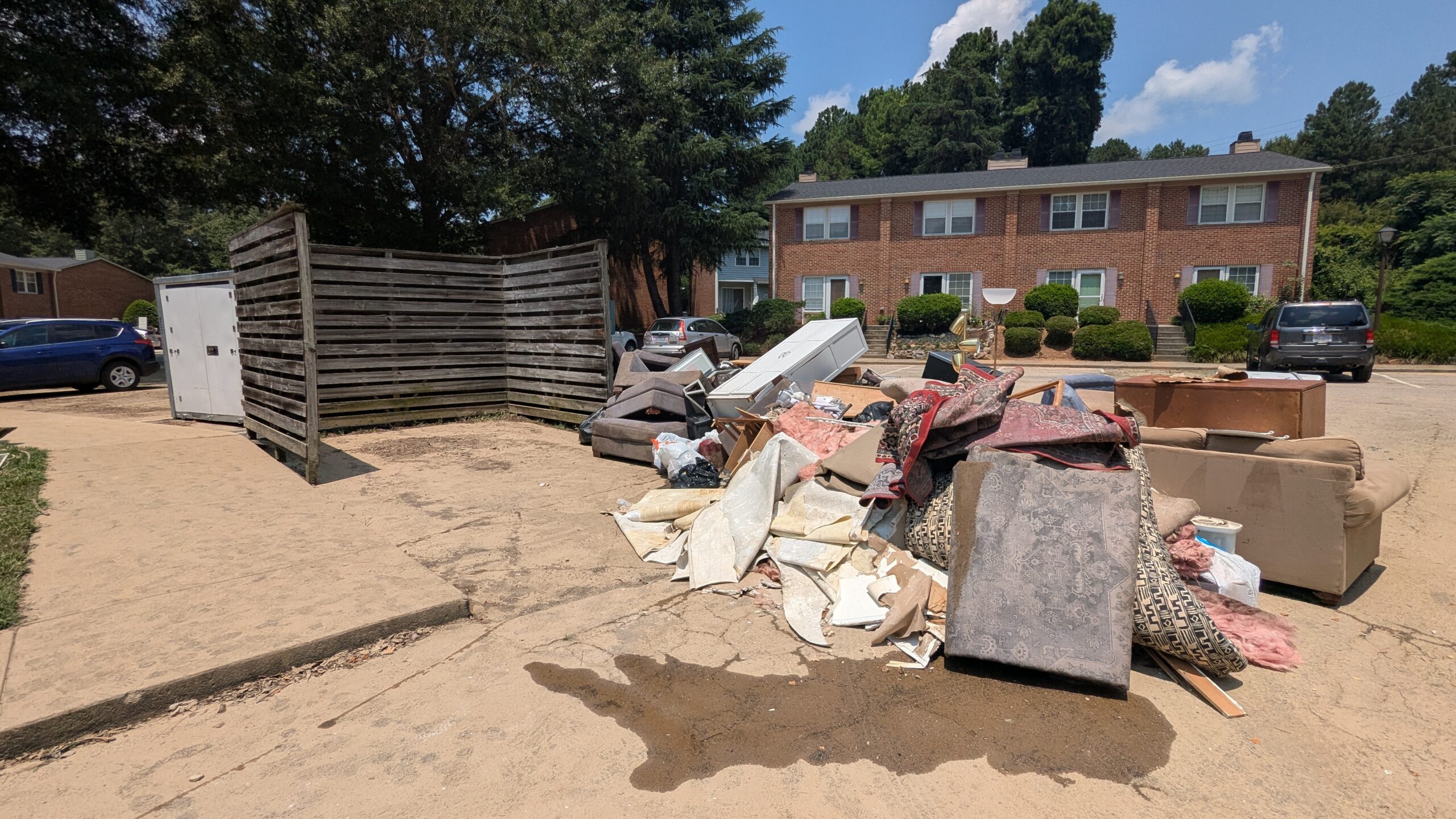 Chris Sherman, who’s owned a townhome in the complex since 2006 and serves on Canterbury’s HOA, pointed out how one of the community’s dumpsters floated away to the edge of the property. He said the priority is helping the displaced people find places to stay in the short and long-term – but preventing mold and other problems is also a main concern. The Town of Carrboro’s inspector and fire marshal came by the complex Monday afternoon to approve the work residents were doing. As a former town employee, Sherman said he believes the local government will need to step up further to help residents.
