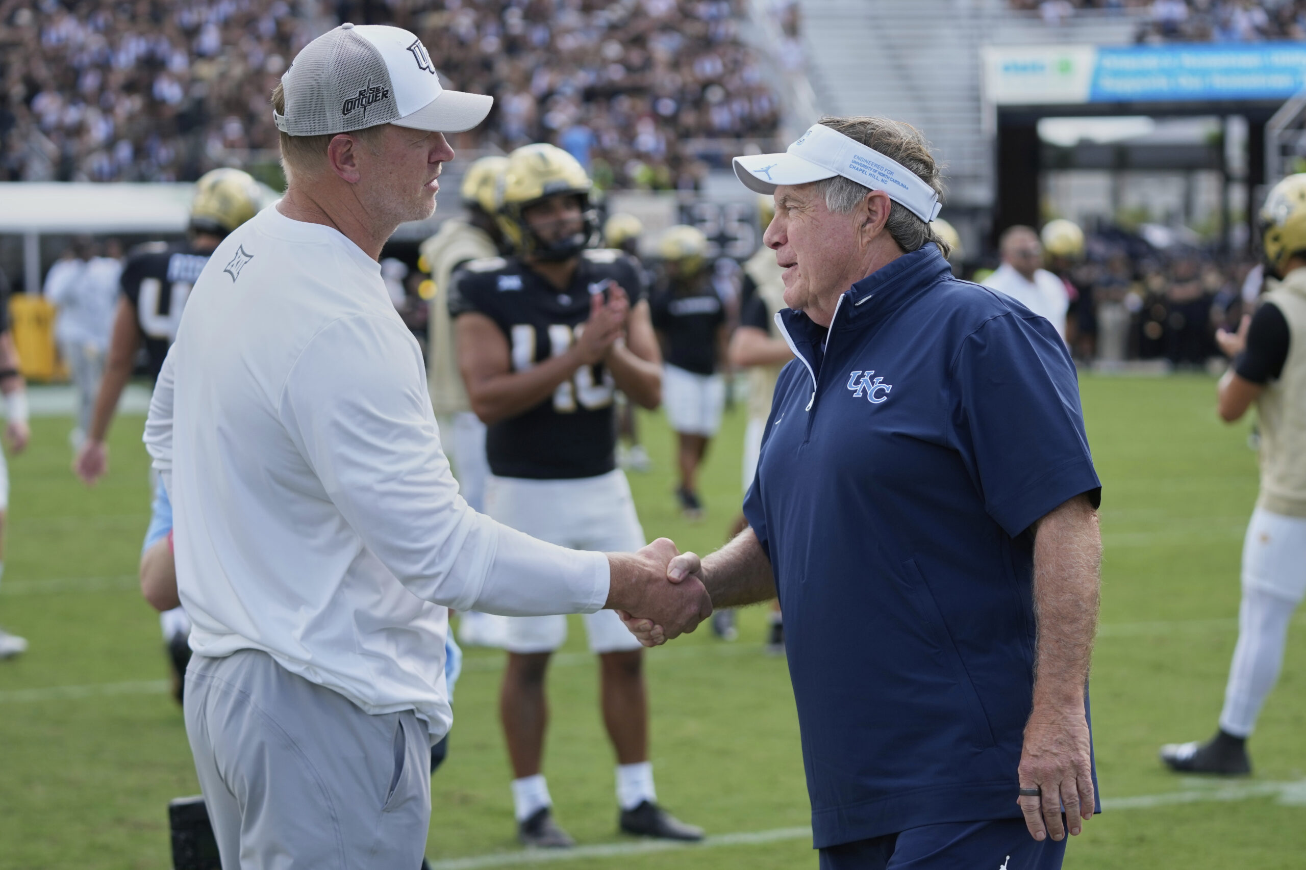 Central Florida head coach Scott Frost, left, and North Carolina head coach Bill Belichick shake hands before an NCAA college football game, Saturday, Sept. 20, 2025, in Orlando, Fla. (Photo via AP Photo/John Raoux.)