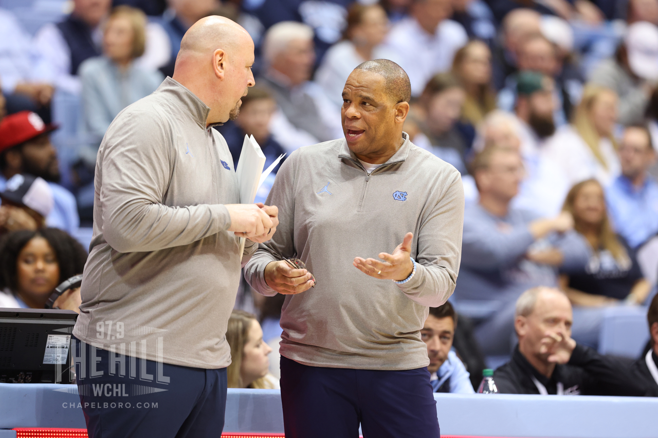 While his team may not be preseason No. 1 again in 2023-24, Hubert Davis and the UNC program still face pressure around an overhauled roster consistently playing better than last season’s team. (Photo via Todd Melet/97.9 The Hill.)