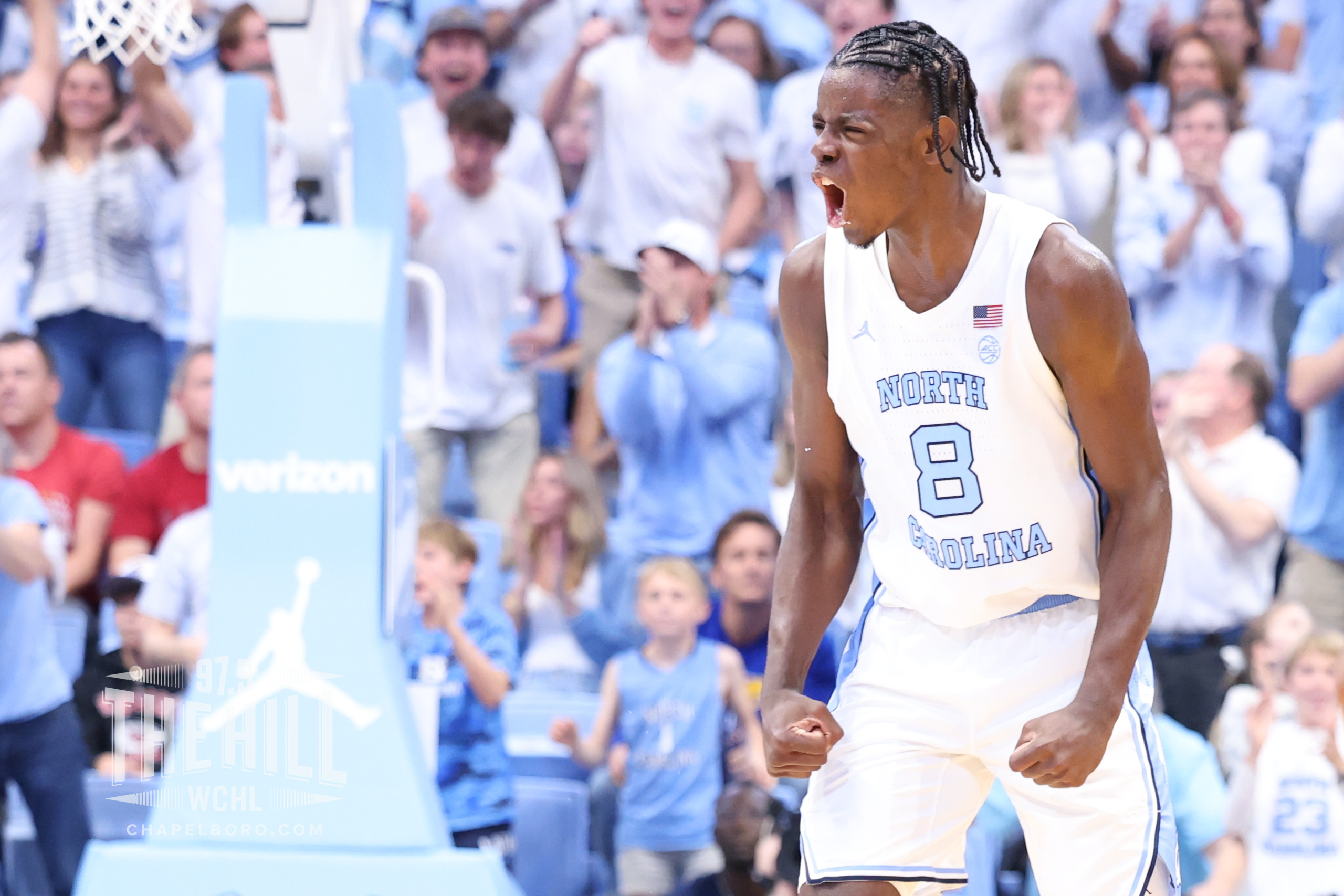 Star freshman Caleb Wilson celebrates a dunk in No. 25 UNC men’s basketball’s victory over No. 19 Kansas on Friday. (Photo by Todd Melet/Chapel Hill Media Group.)