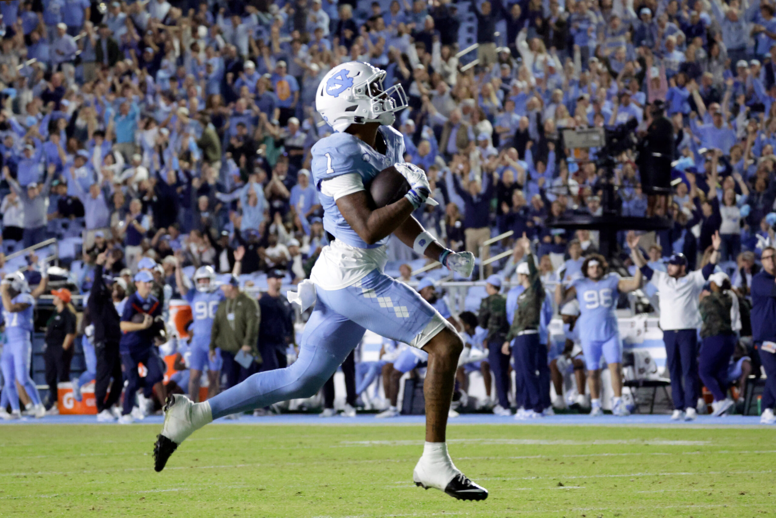 North Carolina wide receiver Jordan Shipp runs for a touchdown during the second half of an NCAA college football game against Stanford, Saturday, Nov. 8, 2025, in Chapel Hill, N.C. (Photo via AP Photo/Chris Seward.)