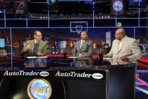 Inside the NBA host Ernie Johnson Jr., left, and analysts Kenny Smith, center, and Charles Barkley speak on the set at the TNT studios in Atlanta, Feb. 4, 2010. (Photo via AP Photo/Erik S. Lesser.)