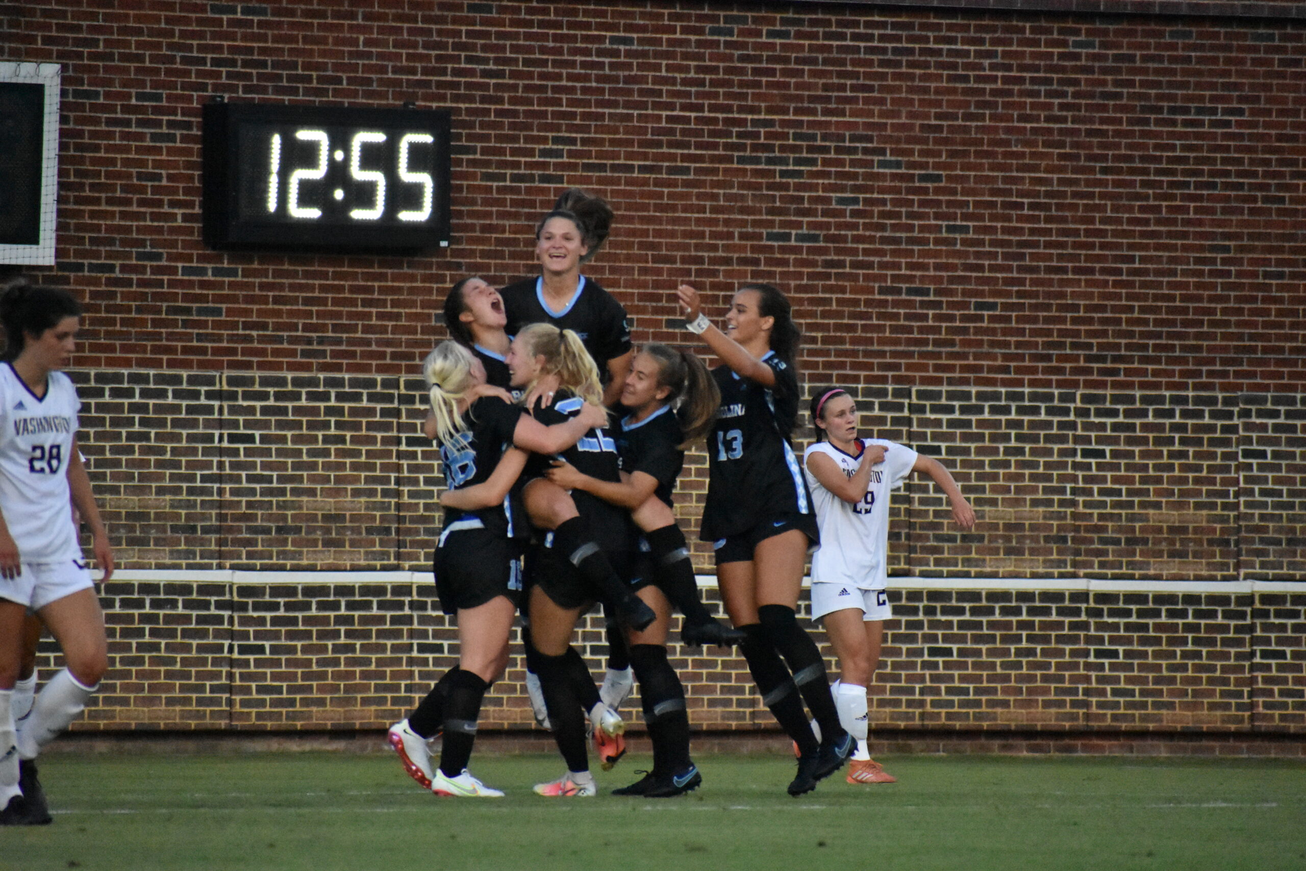 The UNC women’s soccer team celebrates Ruby Grant’s second goal against Washington.