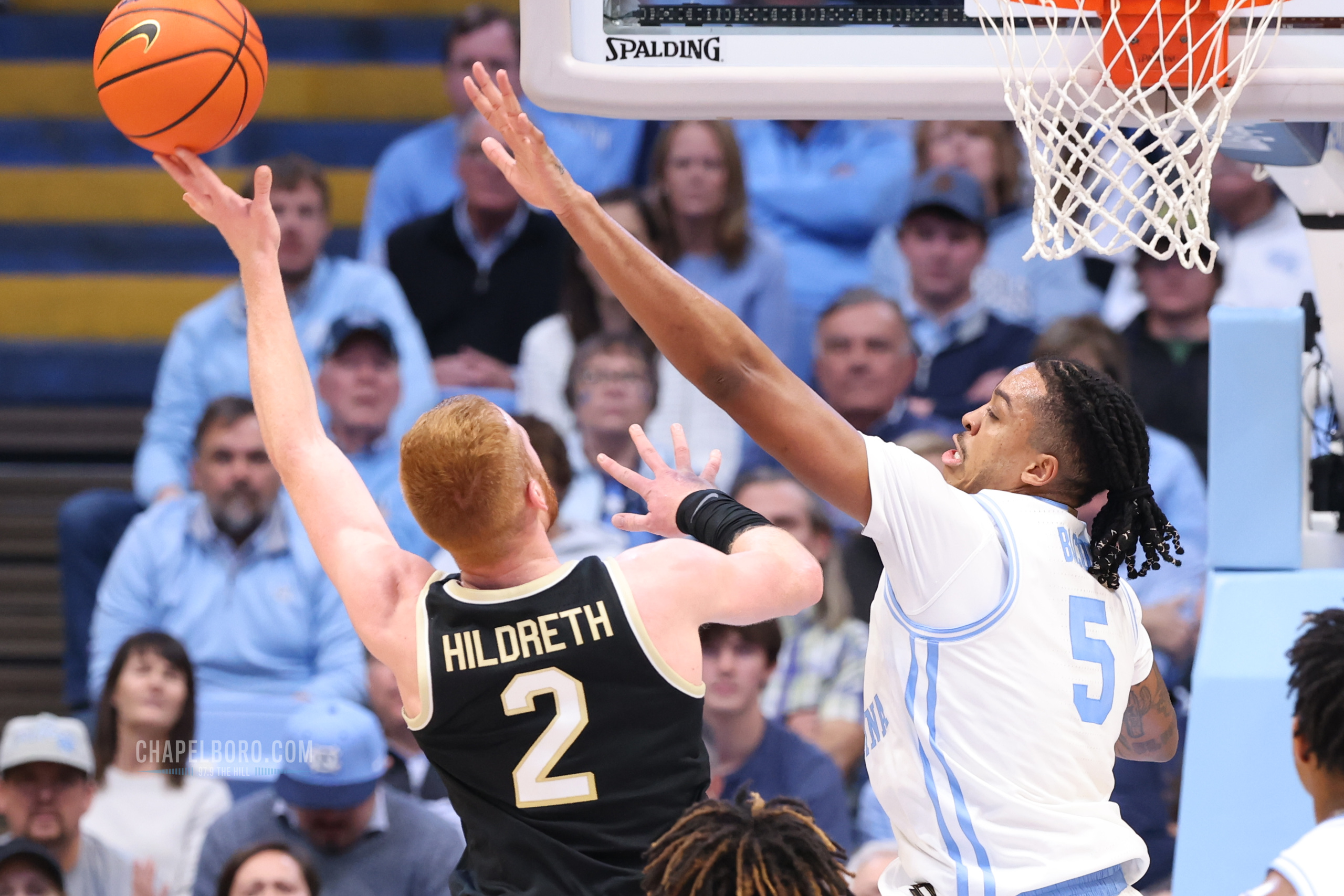 UNC’s Armando Bacot challenges a shot from Wake Forest’s Cameron Hildreth in the second half of UNC’s 85-64 win on January 22, 2024. (Image via Todd Melet)