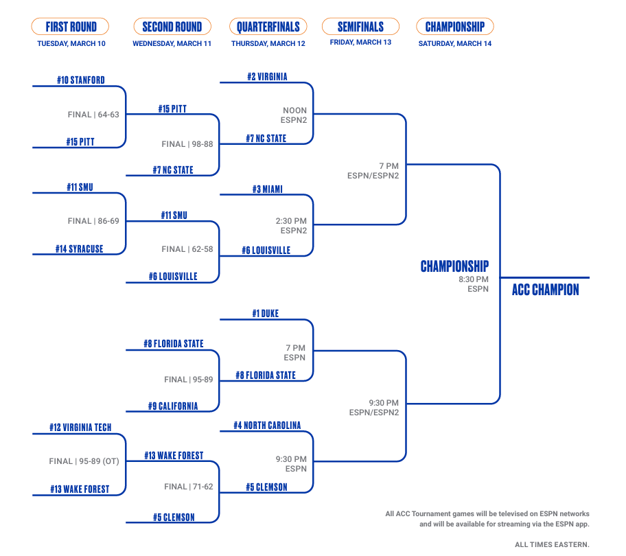 Here's the Complete Bracket for the 2026 ACC Men's Basketball TournamentThe 2026 ACC Men’s Basketball Tournament begins Tuesday at the Spectrum Center in Charlotte. UNC is the No. 4 seed in the field and is seeking its first tournament title since 2016. Here’s the complete tournament bracket, which will be updated throughout the week: For ACC Tournament ticket information, click here. Chapelboro.com does not charge […]