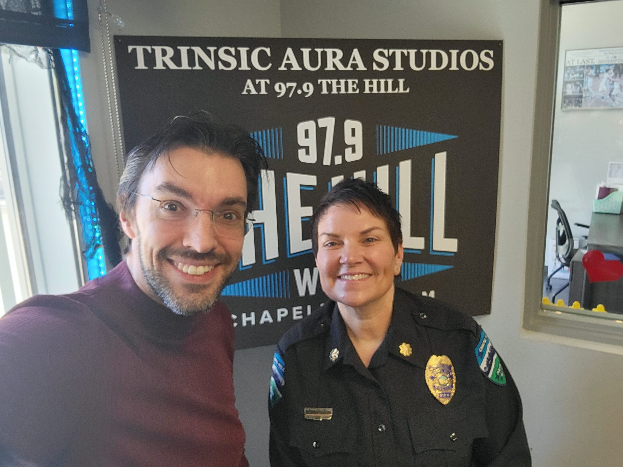 Aaron chats with Chapel Hill assistant police chief Celisa Lehew, who will take over as the town’s next police chief in January.