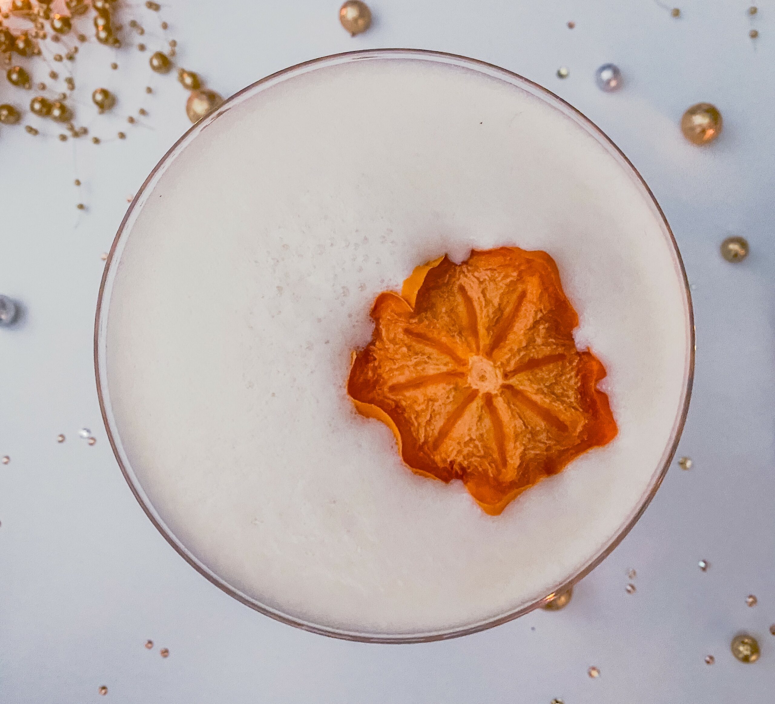 Add gin, persimmon simple syrup, lemon juice, and egg white to a cocktail shaker. I prefer to shake vigorously without ice first, then add a handful of ice and shake vigorously again. I strained my cocktail into a coupe glass, which adds a bit of glamor. I finished it with a dash of orange bitters and a slice of dehydrated persimmon, but a sprig of Rosemary would make an easy garnish if you’re wanting to keep it simple.